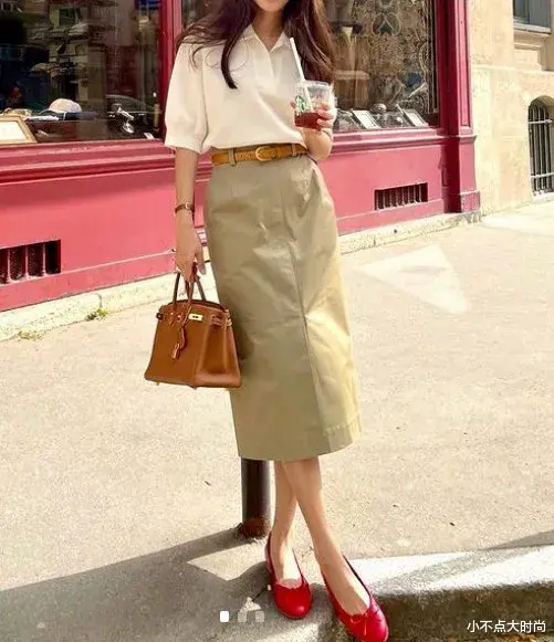 直筒款的高腰卡其裙真是梨形身材小个子的救命单品,高腰很显高、直筒版型修饰身材显高又显瘦,随意搭配一件衬衫,就是很时尚的通勤look.▼