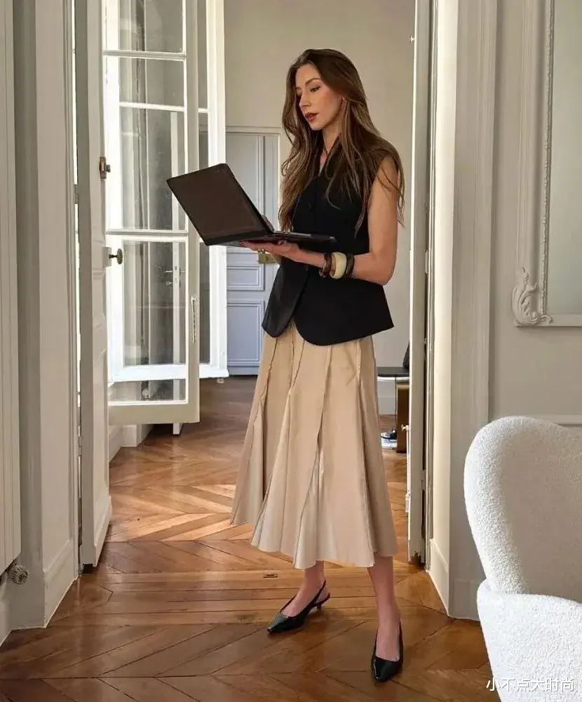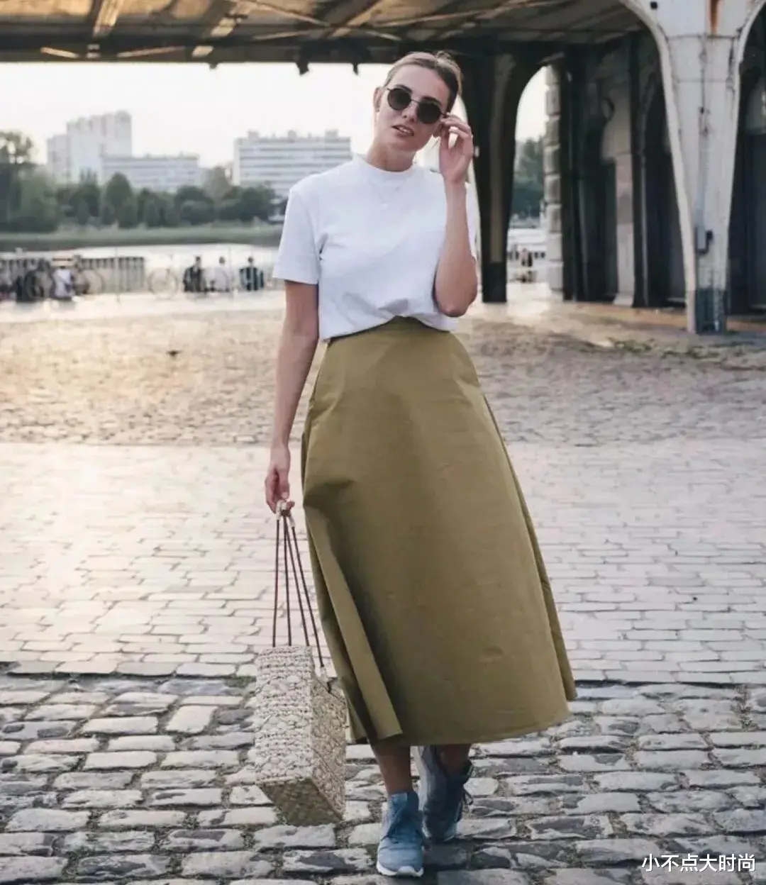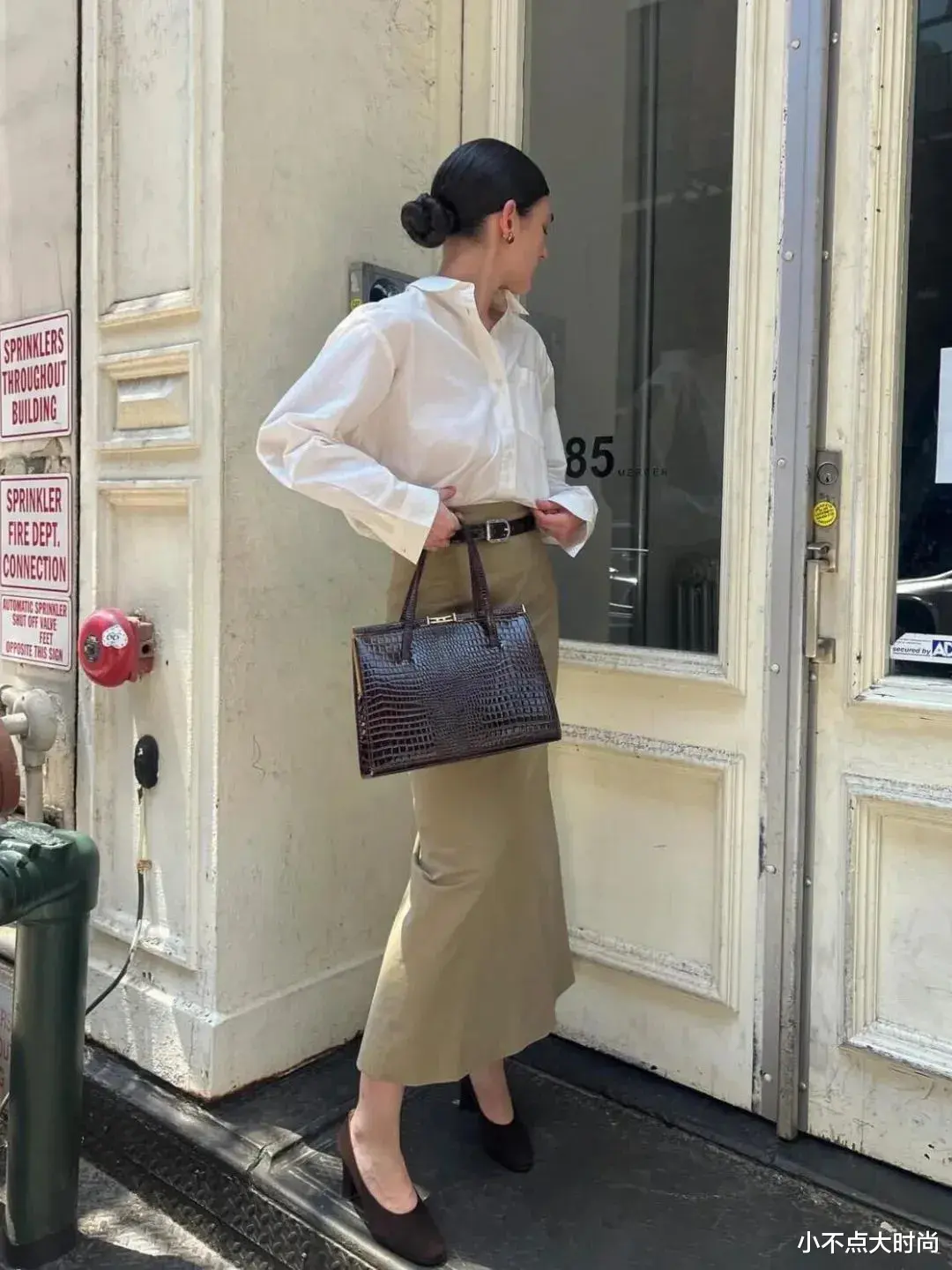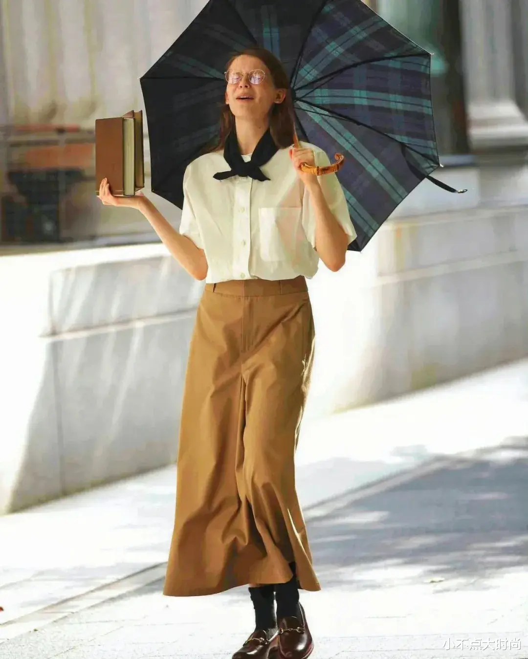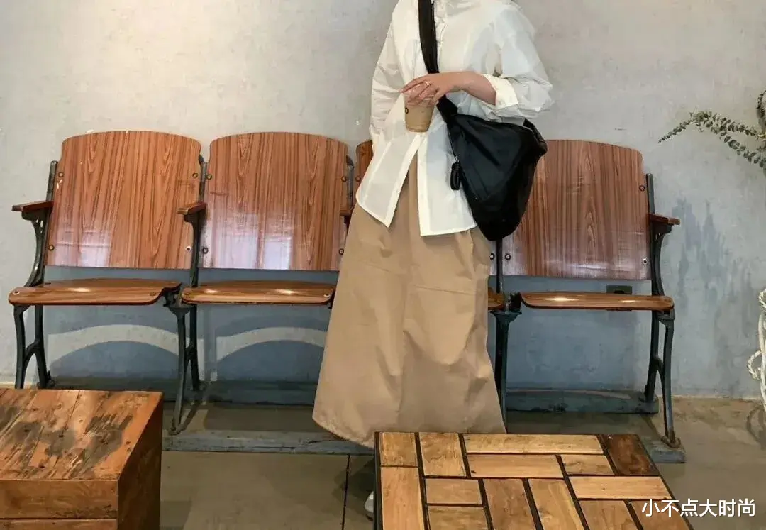 长度适中的淡卡其色长裙,初秋搭配一件白色衬衫,通勤的气质look就get到了,简约利落,知性大方。▼