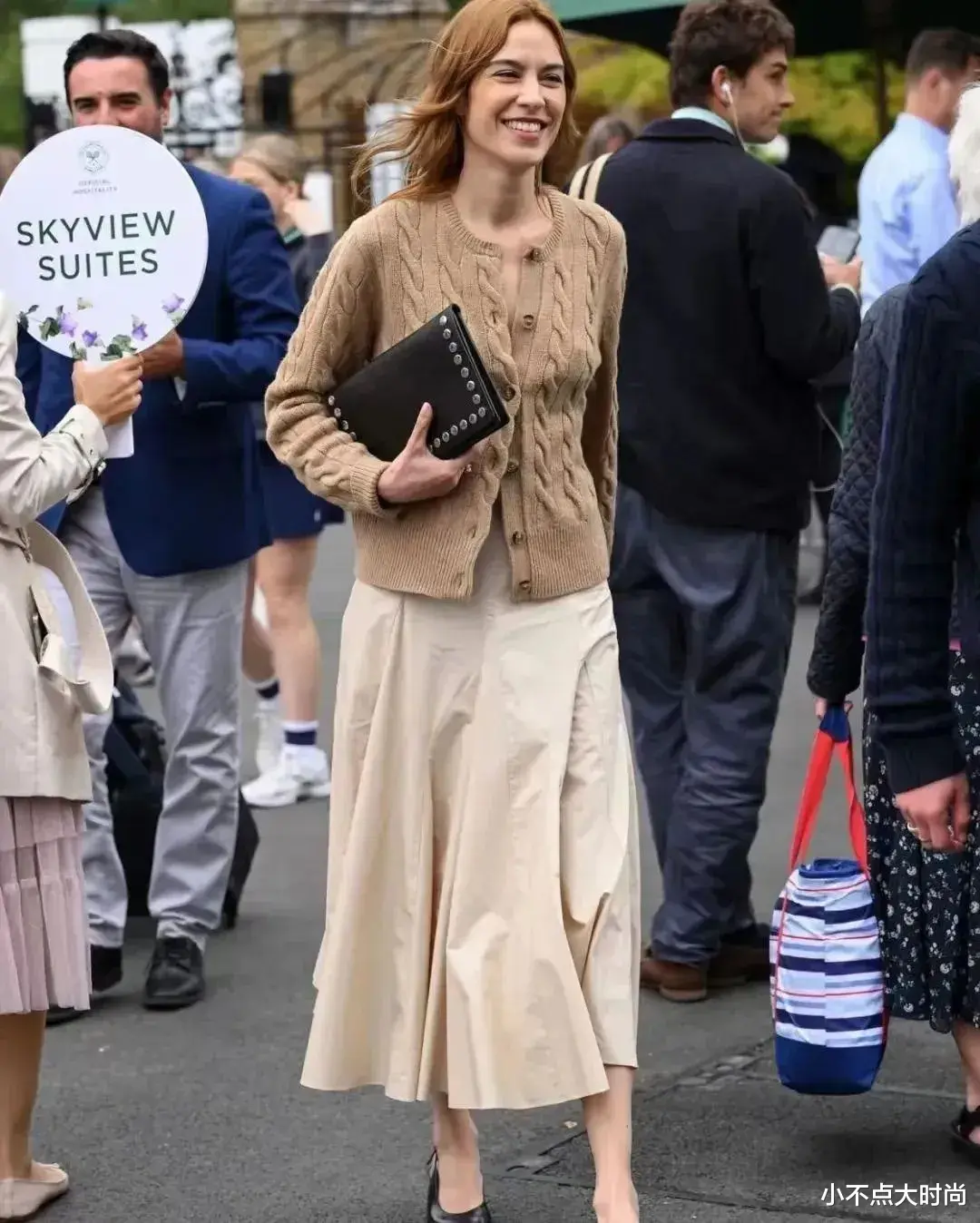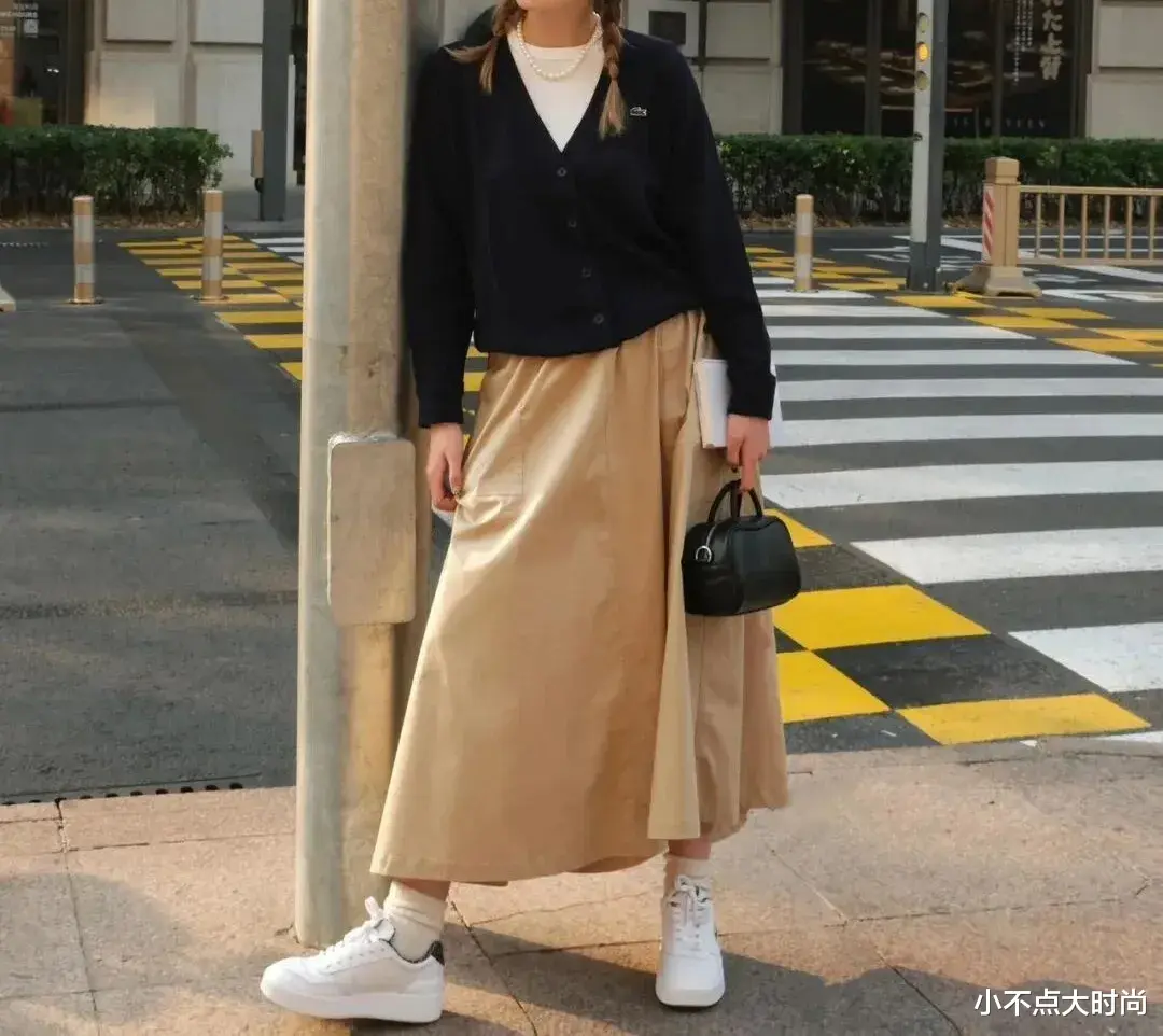 伞状的卡其裙搭配深色的奶奶衫,内叠穿白色的T恤,基础色搭配很耐看又富有层次感。针织衫温柔大方,卡其裙优雅气质,整套穿搭落落大方,时尚又耐看。▼
