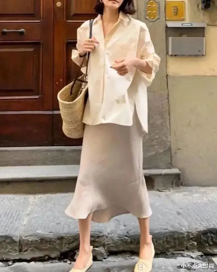 色调淡淡的卡其裙搭配同样淡淡的米色衬衫,清淡优雅,又有几分松弛感,同色系搭配舒服又显高,整套穿搭简约温和,日常低调又有高级感。▼