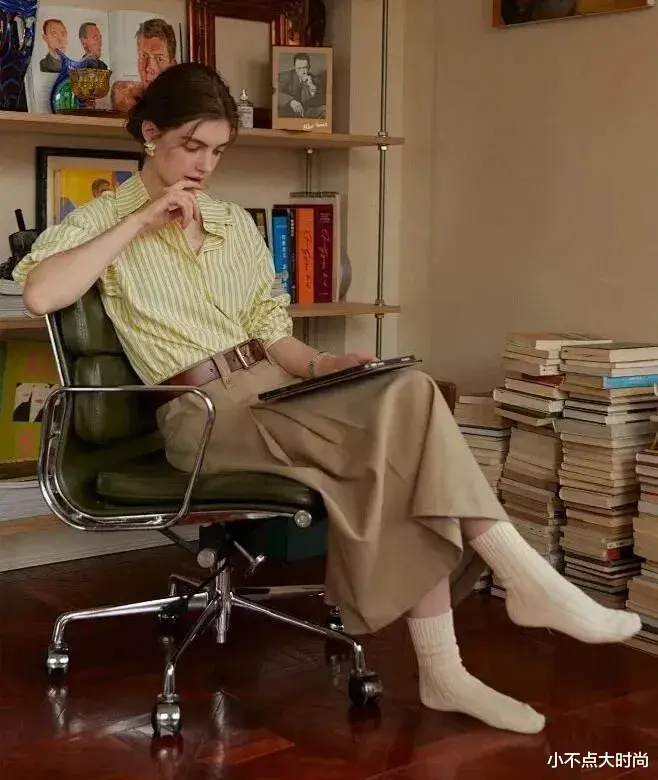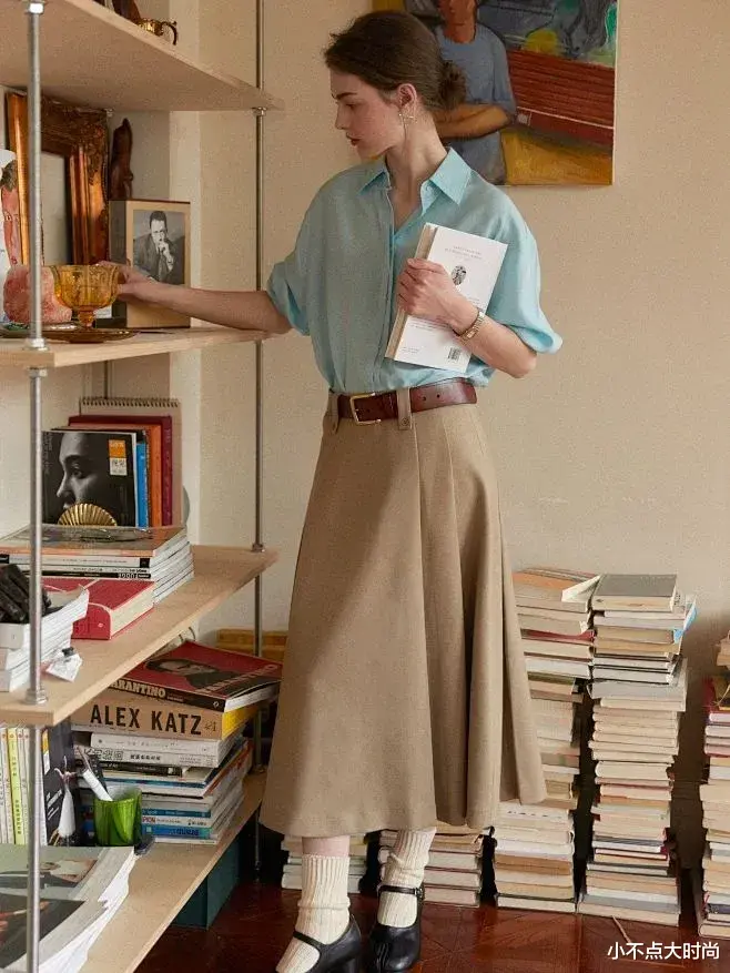 选择有高腰线的“淡卡其裙”很百搭,初秋随意搭配衬衫或T恤,把上衣塞进裙子内,高腰线立显,气质就立显,显高、简约、又高级。▼