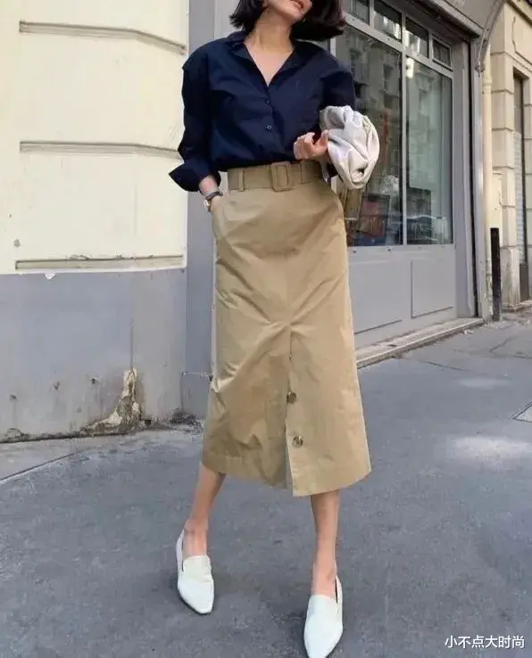 直筒的卡其裙搭配藏青色的衬衫,温和跟沉稳的色彩搭配很经典,让穿搭内敛大方,简约利落又有低调的高级感,小个子穿很有气质。▼