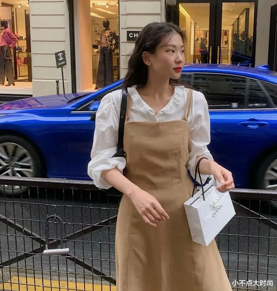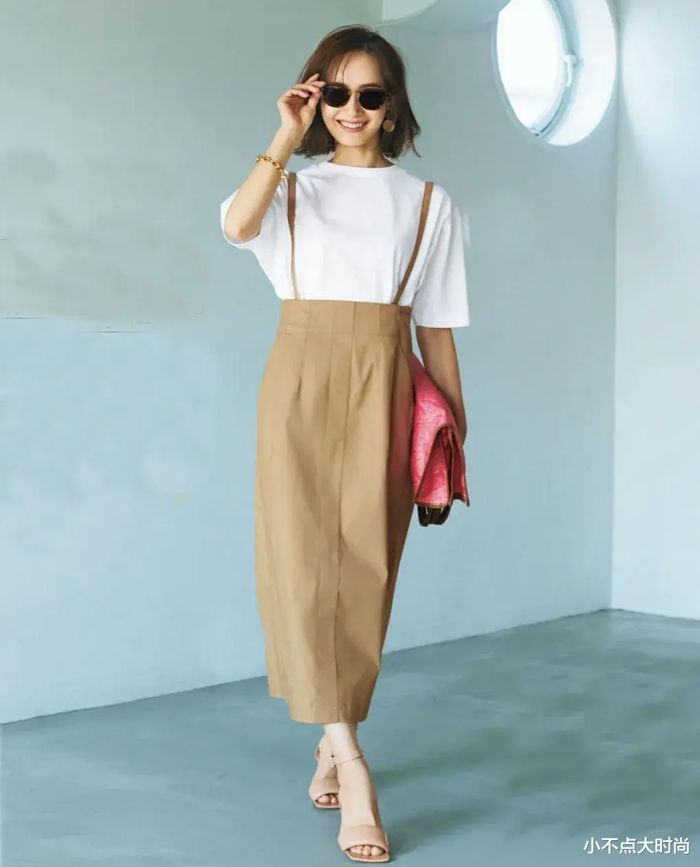 直筒的卡其裙搭配白色T恤,简约利落的同时又增添几分休闲感,让穿搭更舒服、有随性感,两条卡其色的背带装饰适度地减龄,让搭配时尚又大方。▼