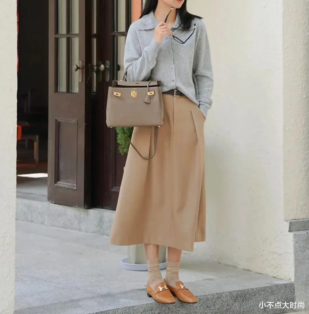 这条淡淡色调的卡其裙,温婉清淡,优雅又不失高级。秋天可以搭配同色系的针织衫,视觉显高又有高级感,温柔优雅,知性气质。▼