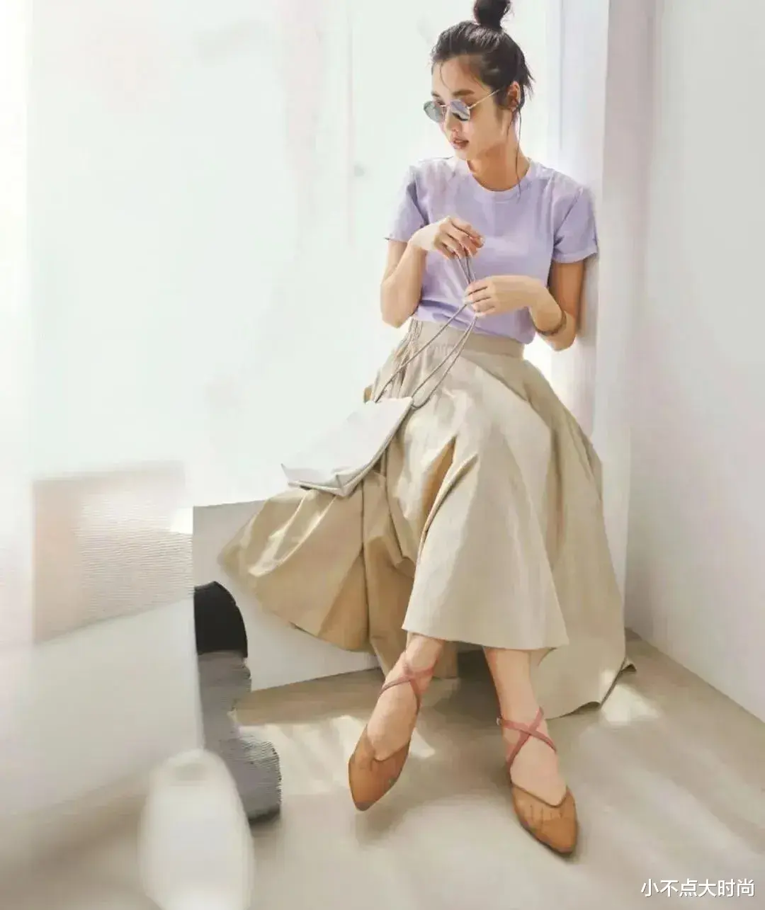淡卡其色的裙子既能满足初秋裙装的优雅,又契合了季节的高级感,也很适合小个子穿,自然地显高和显气质。