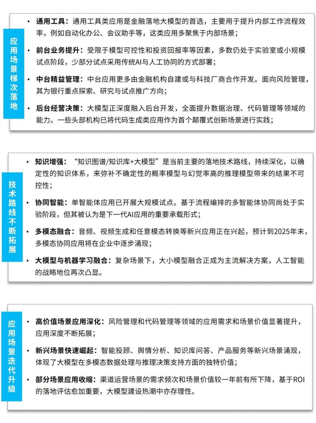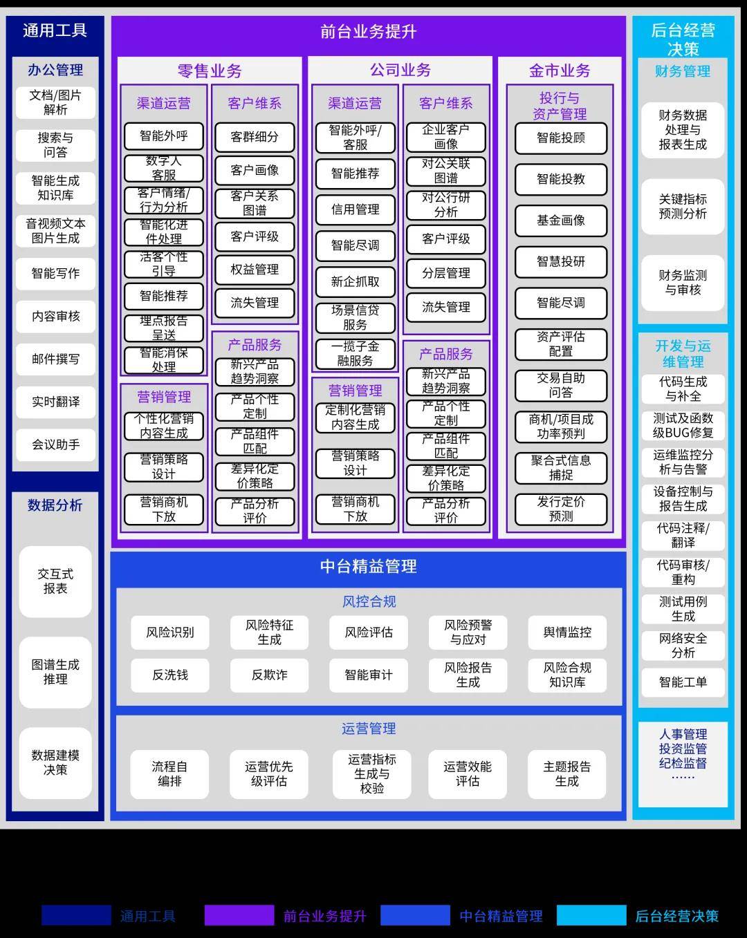 生成式模型的大小协同:在资讯摘要、格式文本生成等低复杂度场景中,70B参数模型凭借其快速响应与低成本优势,可覆盖90%以上的标准化需求。但当涉及投资策略推演、风险因子关联分析等高阶任务时,671B参数大模型展现出的深度推理能力和知识泛化优势。这种效能差异驱动机构构建弹性化的模型协同体系,既避免为简单任务过度配置计算资源,又能确保关键业务获得充足算力支持。决策式模型与生成式模型的多模协同:在信用评分、高频交易等结构化数据处理场景,随机森林、梯度提升树等经典算法仍保持显著优势。通过构建混合模型协同框架,平台可将传统机器学习模型的精准特征提取能力与大模型的语义理解优势相结合,在舆情事件影响评估等复合型任务中,使分析结果的准确率大幅提升。这种多层次技术融合不仅突破单一模型的能力边界,更形成具备自我演进能力的智能生态系统。三、银行业大模型应用建设全景:全面渗透金融业前中后台应用大模型正全面渗透至银行业务的前、中、后台,带来前所未有的效率提升与创新突破,其应用实践呈现分层深化、增强融合与价值重构的特点。