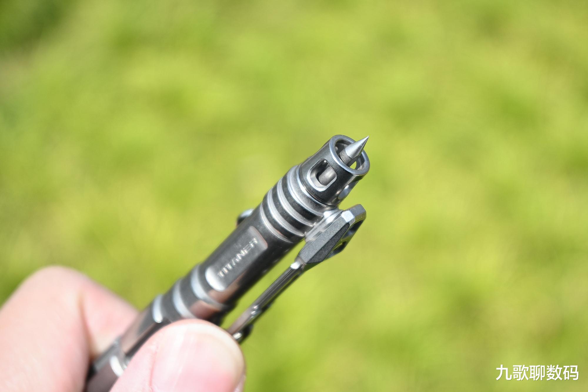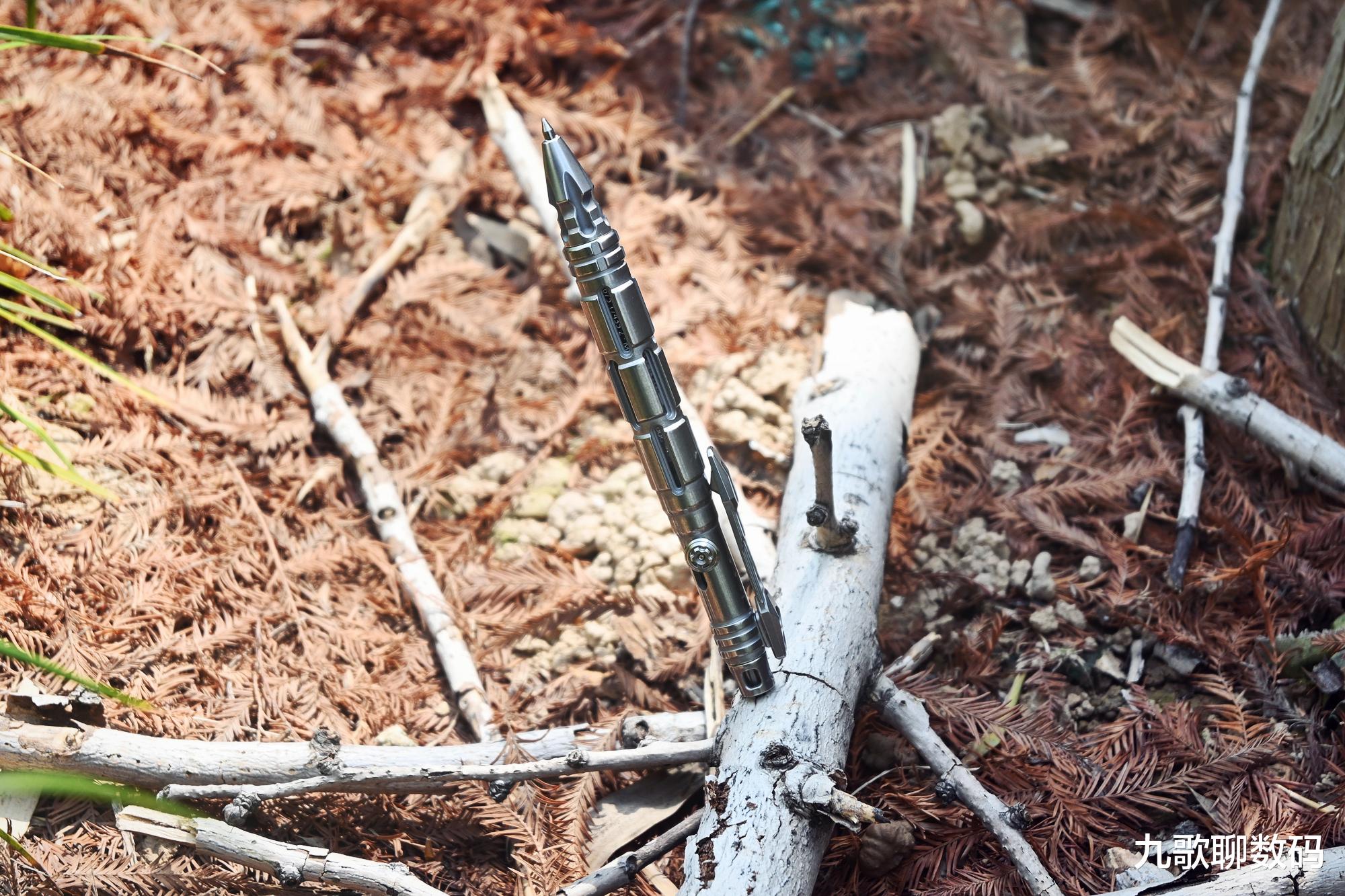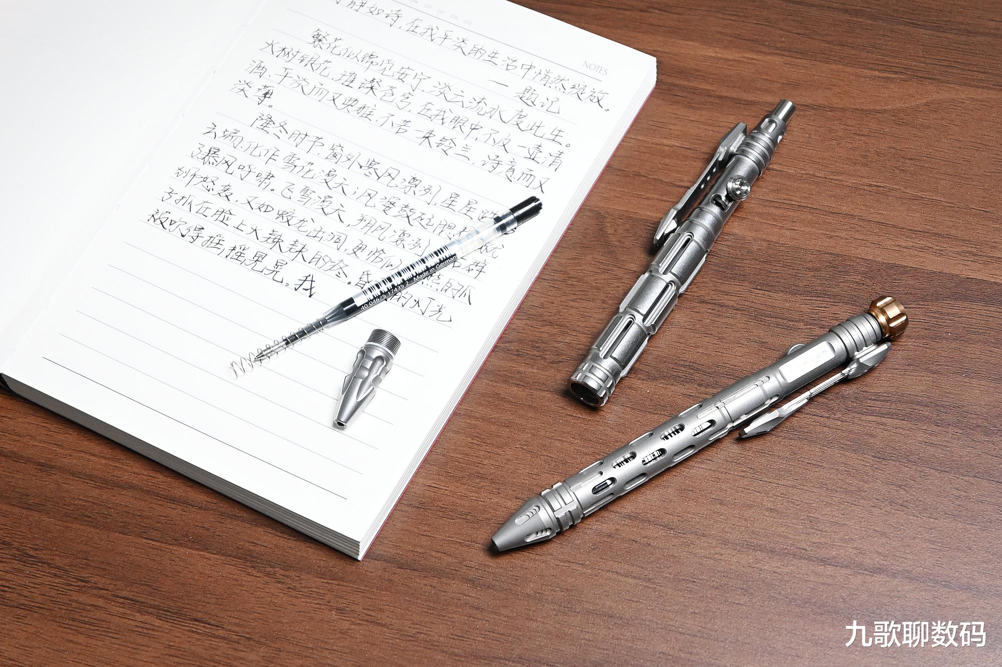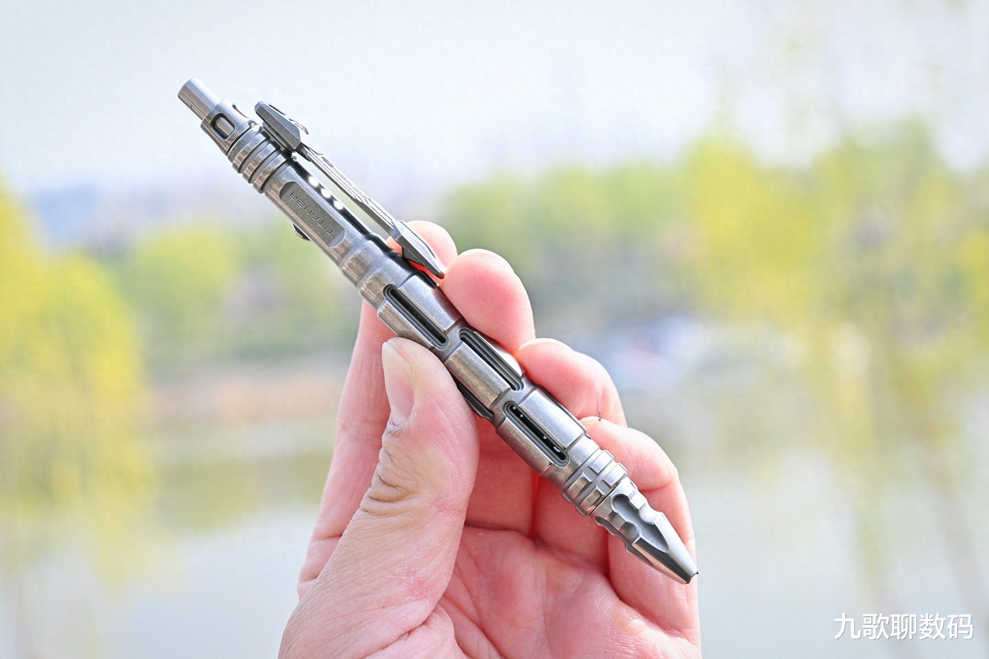 整支笔长148mm,最厚度为17.4mm。与手边的钢笔对比,大小上差不多。它的主体部分为TC4钛合金,而笔头则为博乐M390粉末钢,顶部的战术刺则是N690不锈钢。整重约44克,可轻松别夹在腰间、背包或书本上随身携带。实际使用时可轻到久握不酸,硬到抗摔抗弯。日常磕碰也不会变形损伤。相比廉价的铝合金,其耐腐蚀和抗冲击直接翻倍。