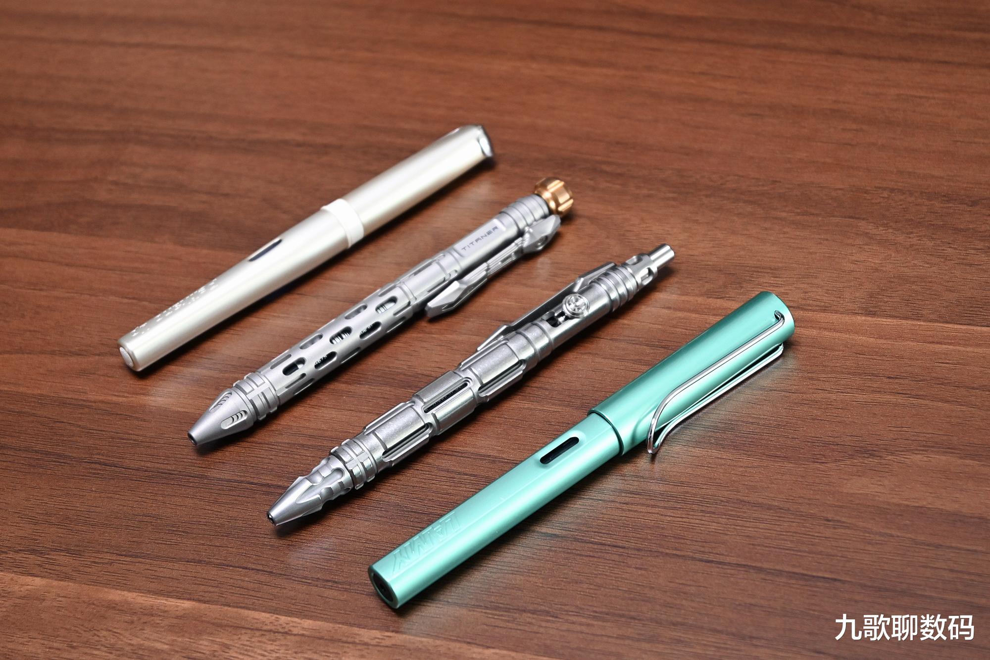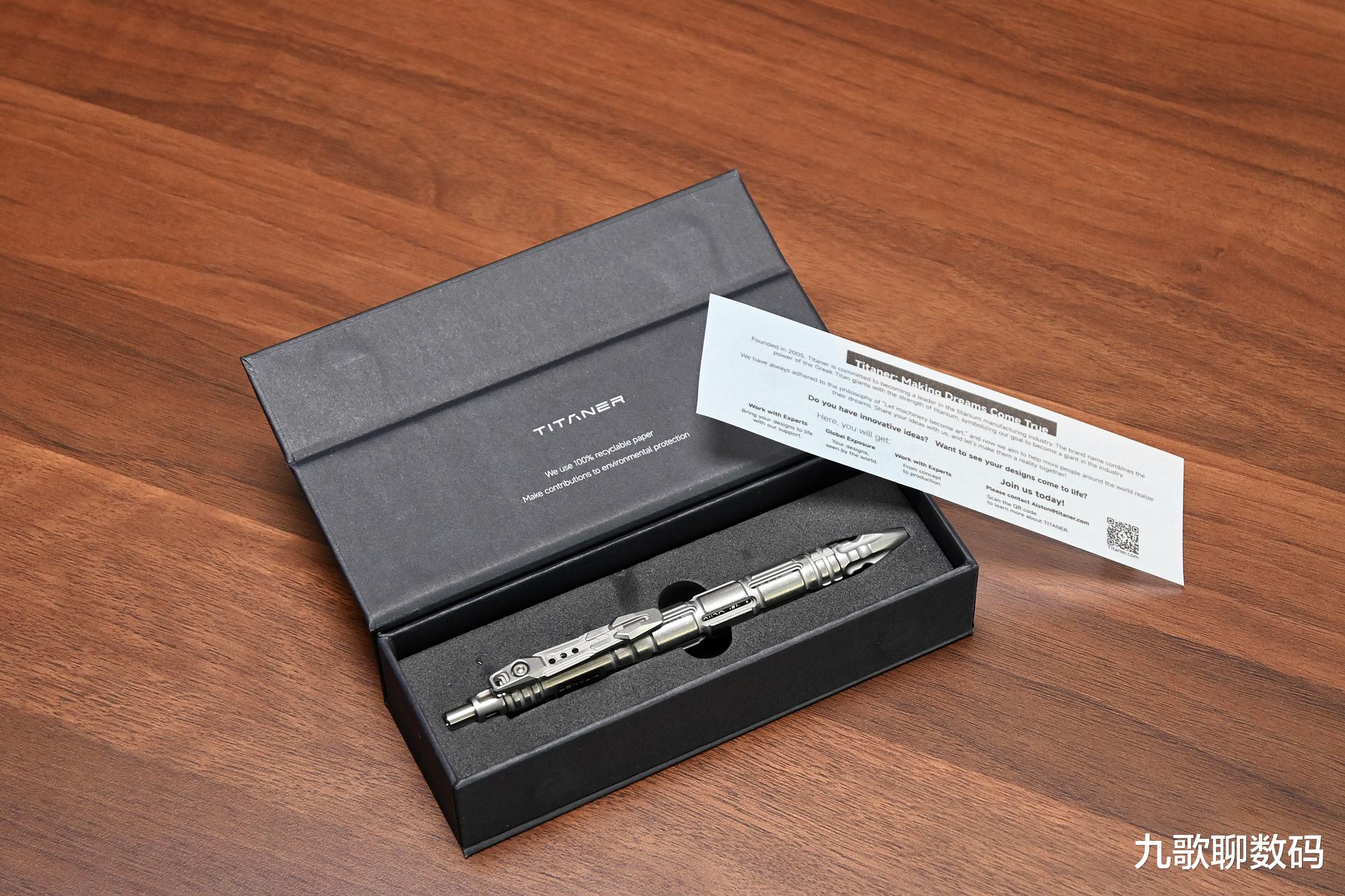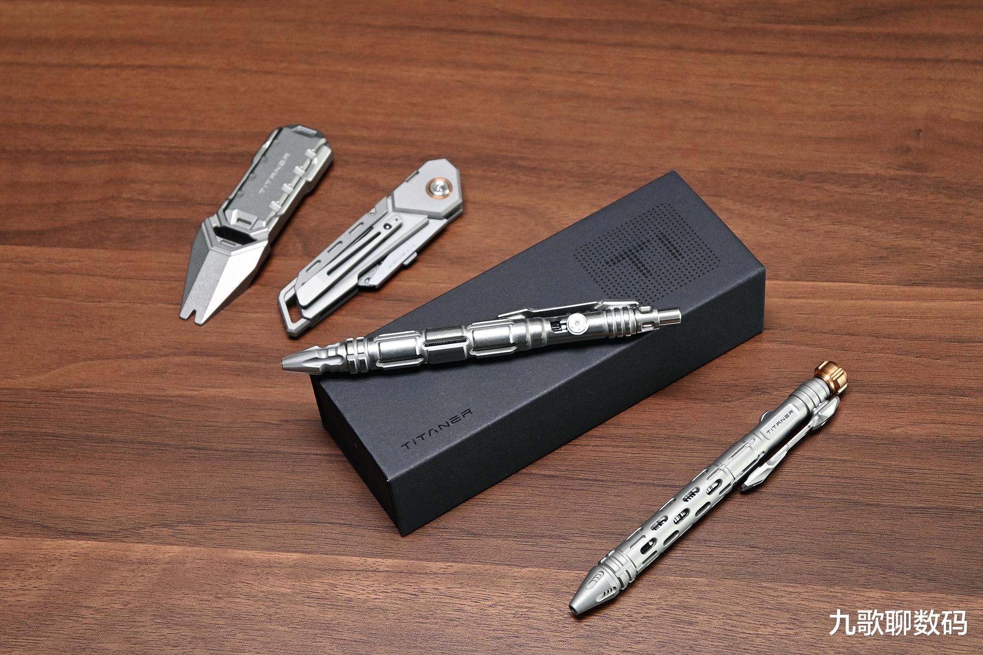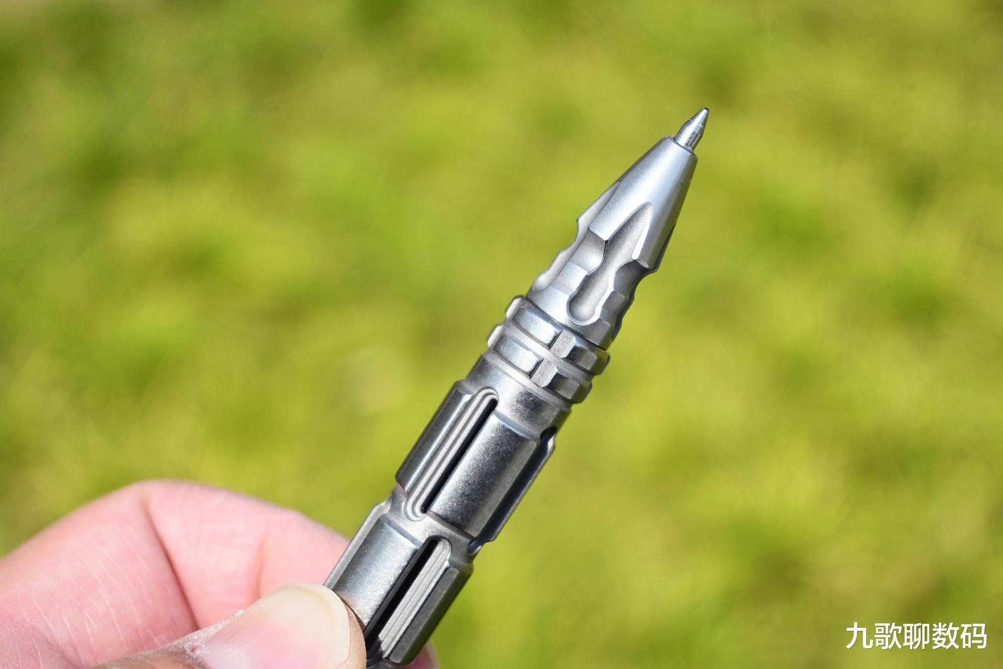 整支笔长148mm,最厚度为17.4mm。与手边的钢笔对比,大小上差不多。它的主体部分为TC4钛合金,而笔头则为博乐M390粉末钢,顶部的战术刺则是N690不锈钢。整重约44克,可轻松别夹在腰间、背包或书本上随身携带。实际使用时可轻到久握不酸,硬到抗摔抗弯。日常磕碰也不会变形损伤。相比廉价的铝合金,其耐腐蚀和抗冲击直接翻倍。