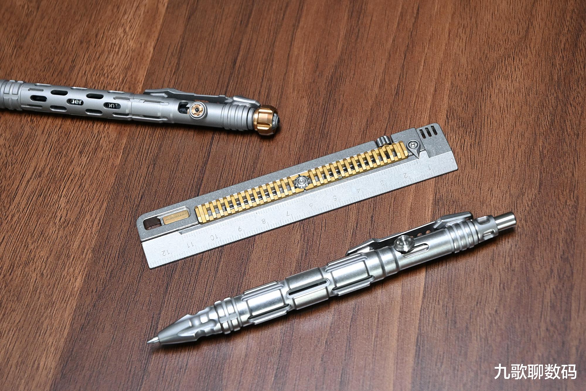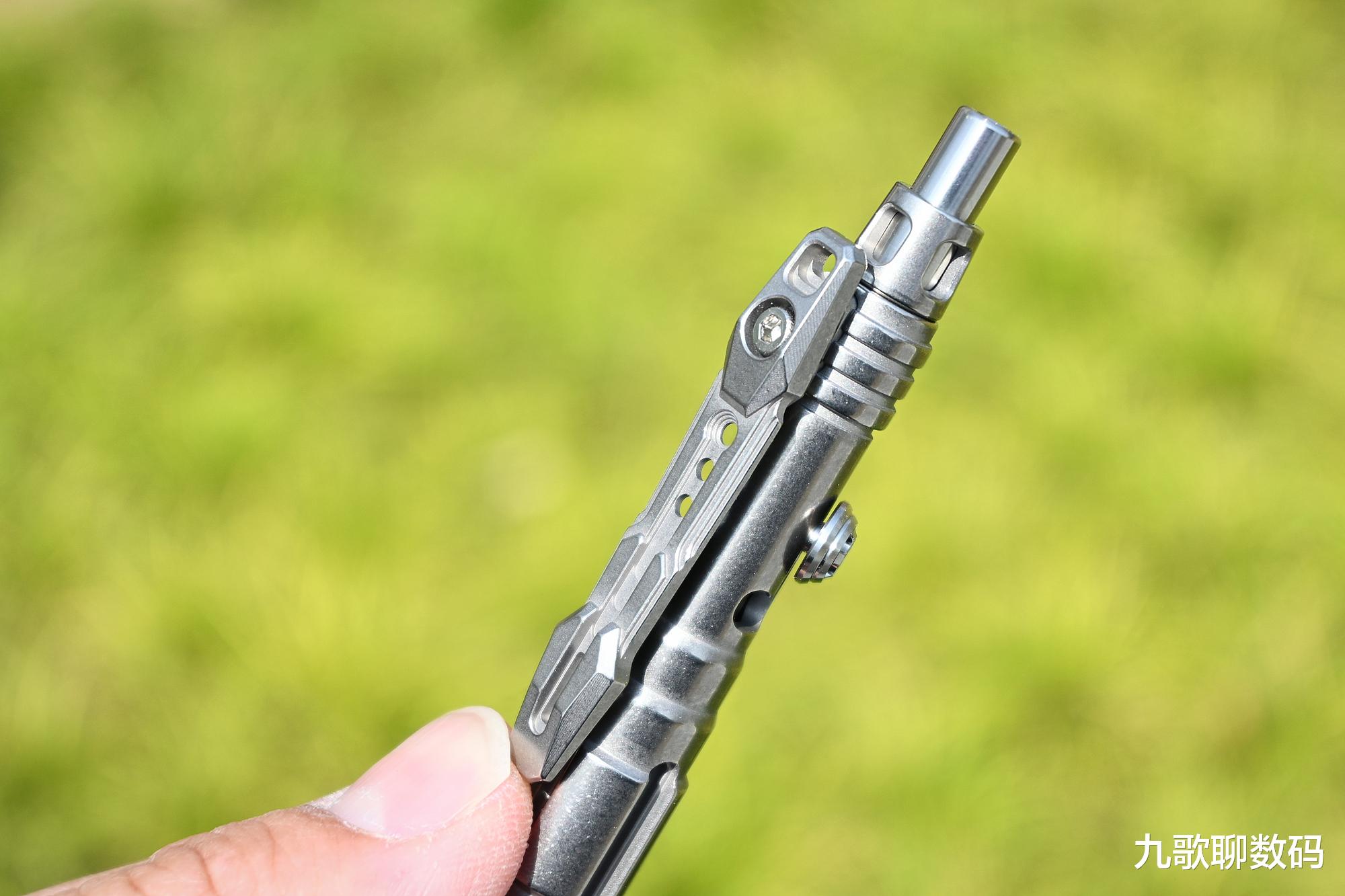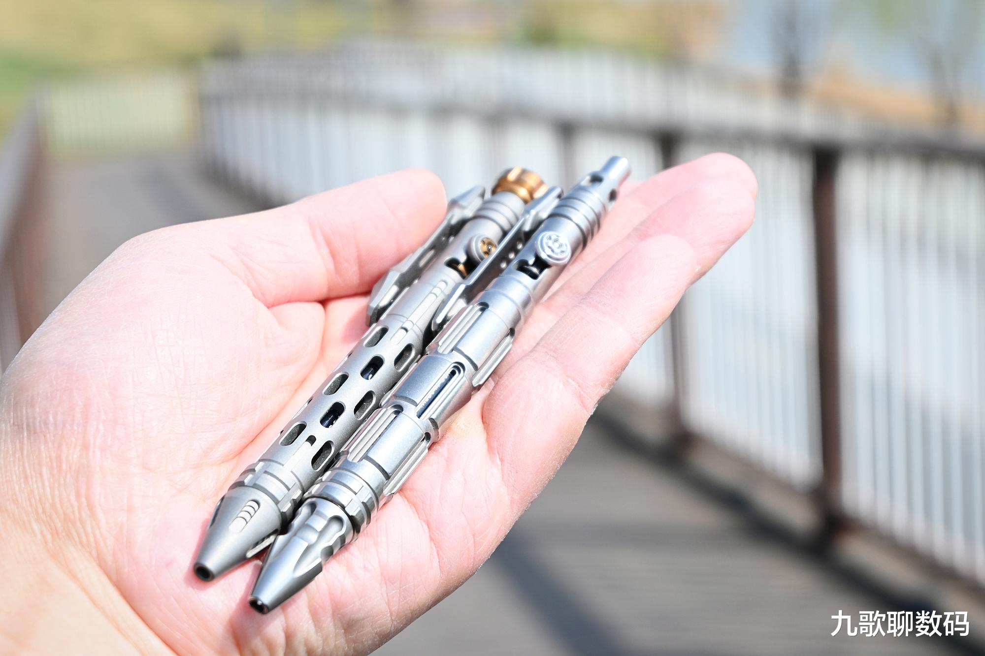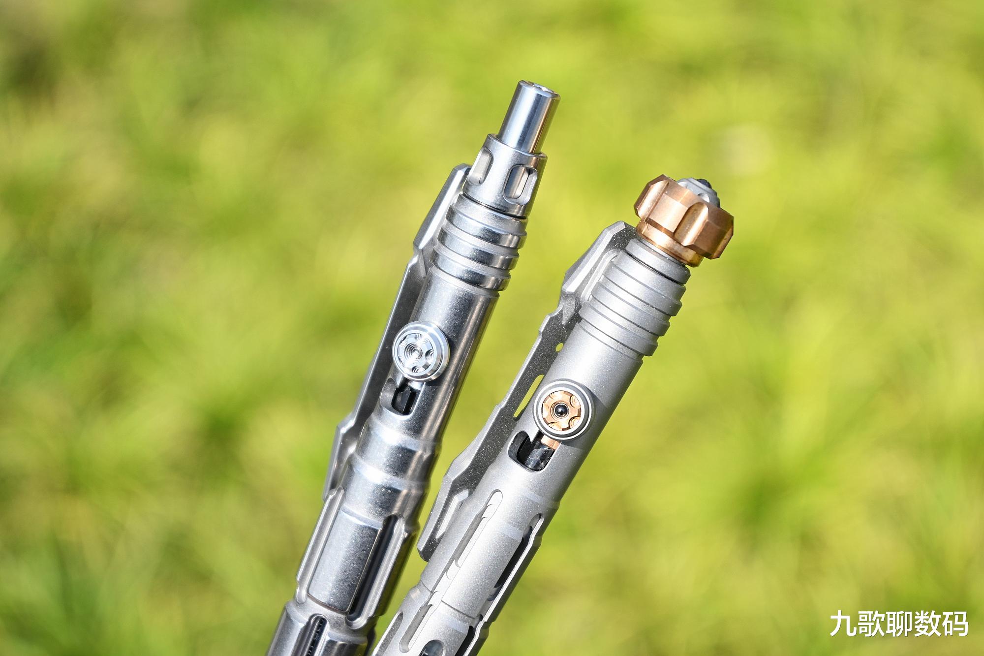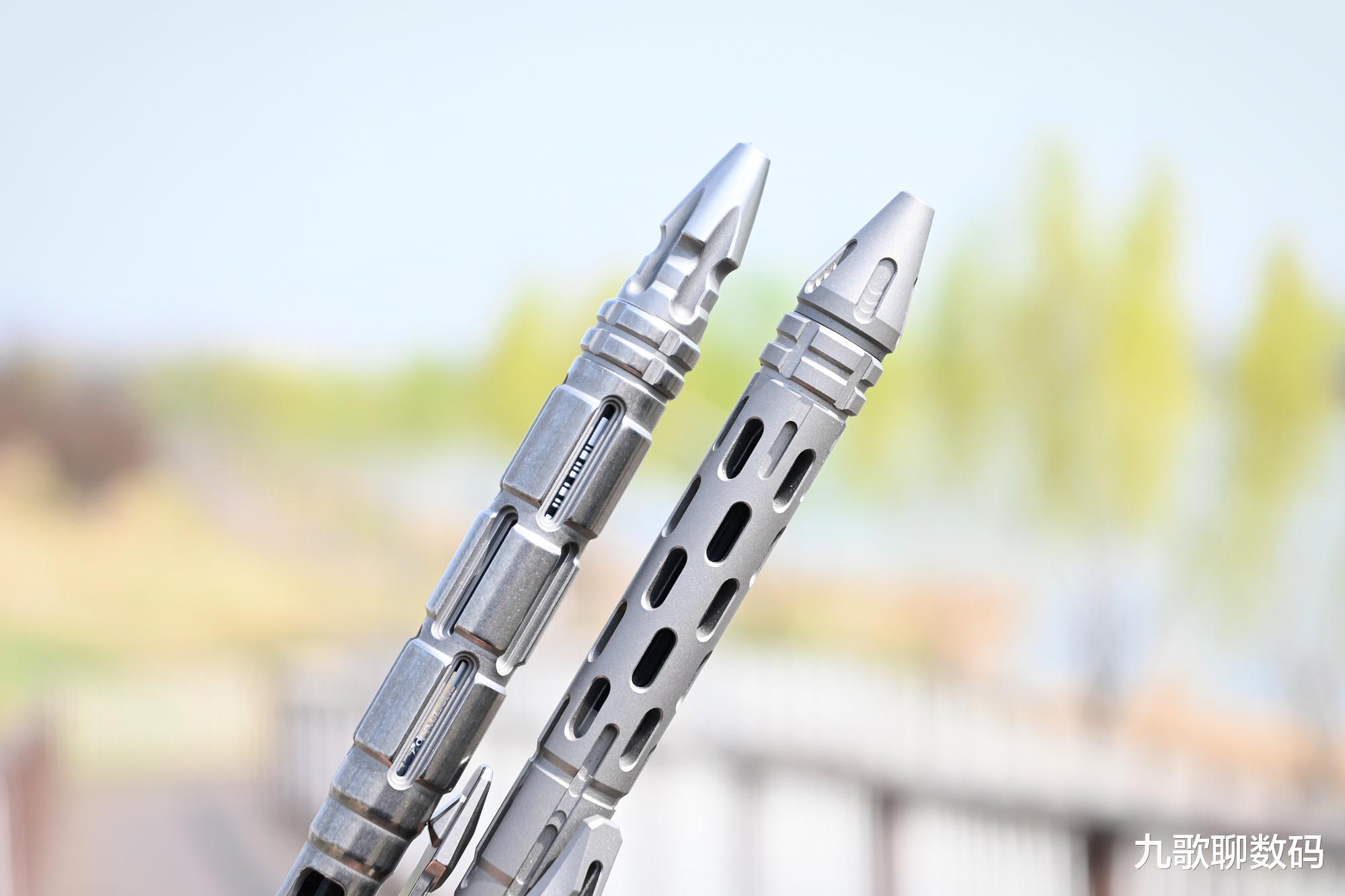 二者相较,星矢的笔握虽仍有镂空(由此可以看到内里的用墨残量),但相比后星铳要低调很多。而笔身头尾则增加了矛头与暗刺,日常能拆快递包裹,清理缝隙污垢;而危急时则可用来逃生、自卫。