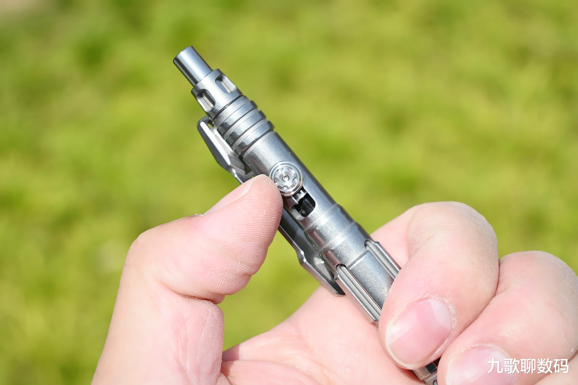 而L型“枪栓”结构的出芯也是战术笔的经典,拉栓上膛,拨弹回芯,一气呵成,不止于书写用到,闲时还可成为解压利器。星矢继承了星铳那轮毂状的拉栓推钮一体式设计,不仅圆润不硌手,且不用担心久用掉落的问题。只不过内轮毂由之前的磷青铜改为了更具一体感的同材质配色。