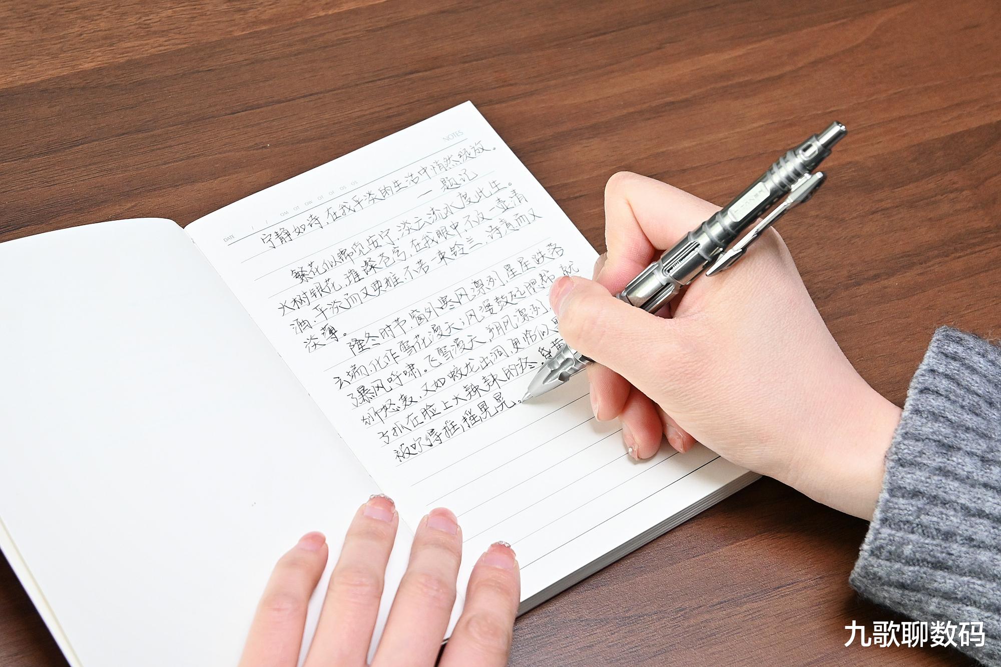 正好也来看下笔芯,其采用了德国进口施耐德G2,试着用其写上一篇抒情散文,握笔写字的过程很还是很舒服的,出墨也很均匀,整个书写十分流畅,不会出现飞墨、断墨的情况。其颜色饱满厚重,有着良好的附着力。当然后期我们也可以选择欧标G2笔芯来做为平替,更划算。