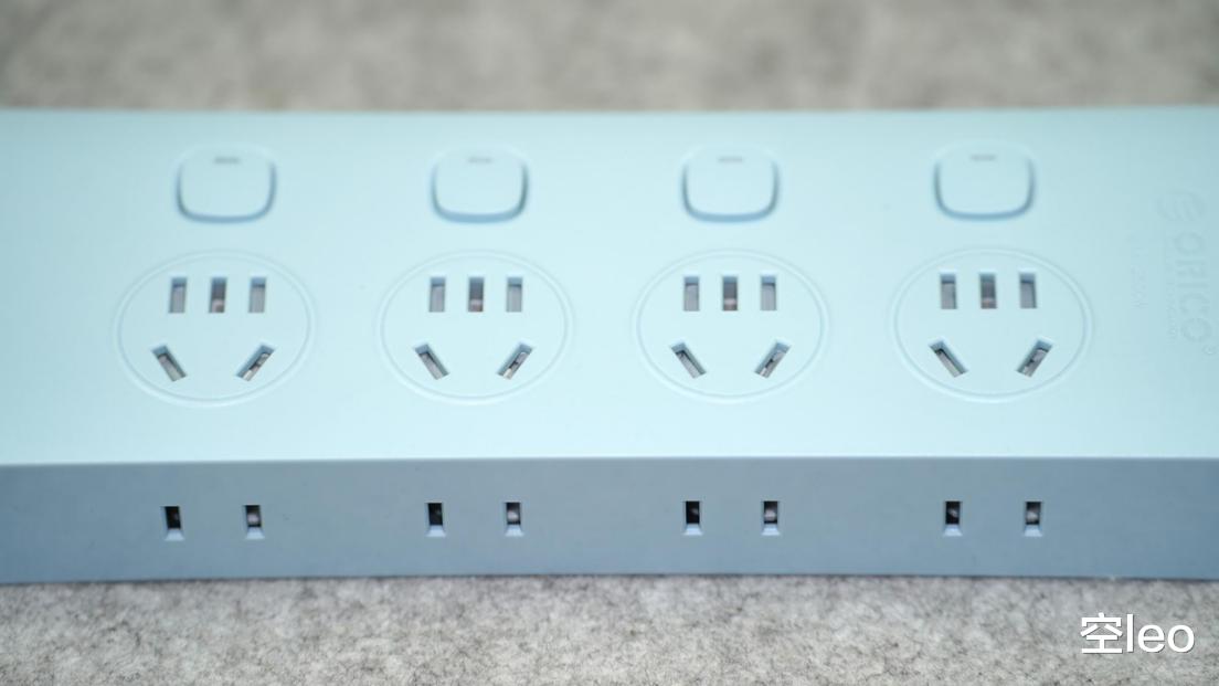 奥睿科分控小胖条插排的设计简洁有力,尺寸为239*72*30mm的紧凑长方体,放在桌面上只占很小空间。这款产品提供紫色、蓝色、白色和黑色四种选择,而我选择了天空蓝这种色调,看起来更加清新一些。