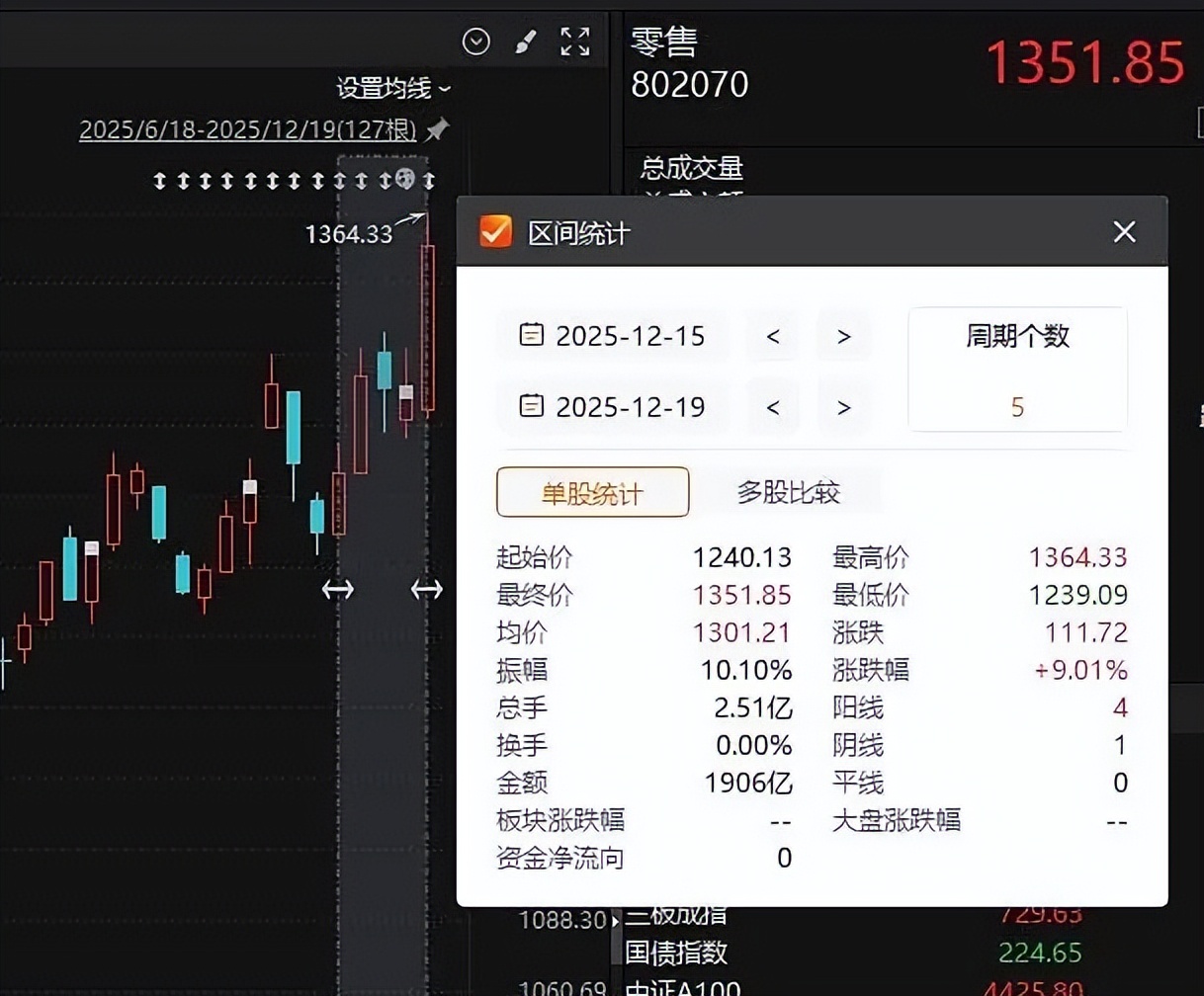 最猛的就是零售行业,近一周涨幅超过了9%,成分股里面,中央商场、永辉超市、百大集团的股票大涨。