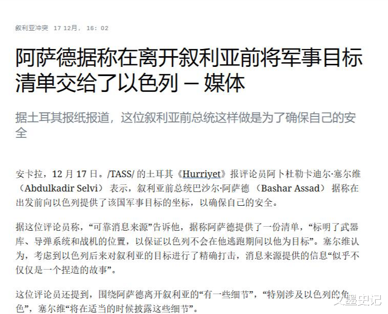 感觉这有一种“破罐破摔”的意思,据俄罗斯媒体的消息,阿萨德在离开叙利亚前,通过某种渠道向以色列军方递交了一份详细“轰炸清单”。