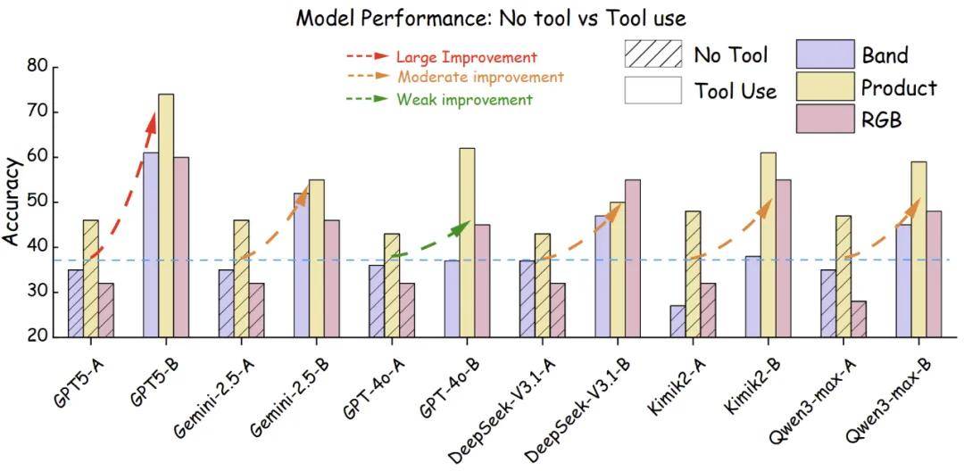 为了验证 Earth-Agent 的能力提升来自于 LLM 对于工具的调用而非其他的因素,研究者对 Earth-Agent 进行了系统的消融实验,划分为 A 组:不使用工具;B 组:使用工具。结果表明,在 LLM 无法使用工具的情况下,不同的 LLM 准确率都在 37%(图中蓝色虚线)。