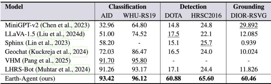 研究者还将 Earth-Agent 和通用的 Agent 架构以及 MLLM 方法进行了横向对比,可以发现 Earth-Agent 在各个 Spectrum、Products、RGB 三个模态的效果领先于通用的 Agent 架构,并且在经典的遥感分类、检测、分割任务中相比于 MLLM 都取得了领先的性能,这验证了 Earth-Agent 在地球观测任务的巨大应用前景。