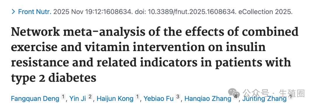 Network meta-analysis of the effects of combined exercise and vitamin intervention on insulin resistance and related indicators in patients with type 2 diabetes. Front Nutr. 2025 Nov 19;12:1608634. doi: 10.3389/fnut.2025.1608634.