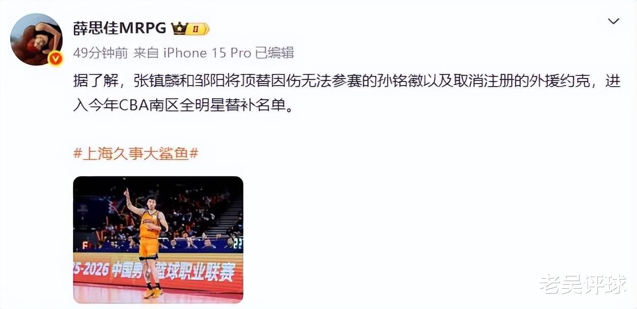 第三个消息,据东方体育日报记者薛思佳透露,孙铭徽因为伤病,浙江队外援约克被裁掉,所以张镇麟和邹阳将顶替两人进入全明星南区的替补大名单。