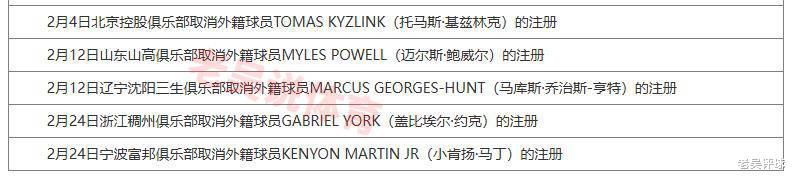 第二个消息,CBA官方网站显示,浙江稠州男篮取消盖比埃尔·约克的注册,宁波富邦町渥男篮取消小肯扬·马丁的注册。
