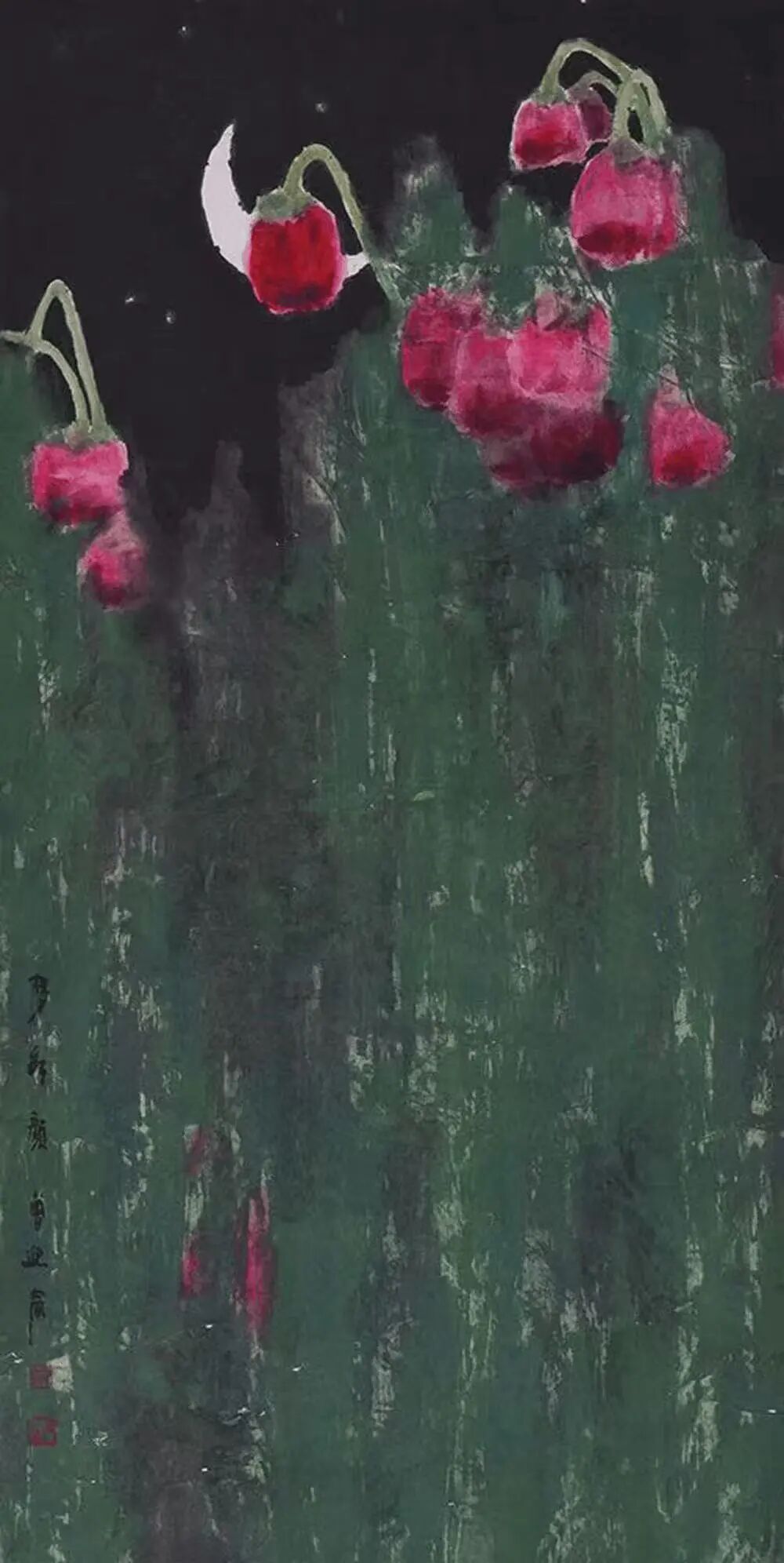 时刻描写自己;古今中外画坛上的大手笔者,其画作感人之处必然是有特殊的东西打动人。这特殊的“东西”无非是指鲜明的个人艺术风格,或以整体气势逼人,或以构思超凡感人,抑或是构图的不一般,造型概括力强又准,颜色震撼人心,表现手法新颖等等,这一切皆是击穿观者之心的子弹。我第一次看迎春的画,就深深地被打动了,就像看到她的心,透明、清纯,富有激情。迎春的画个性突出,风格异人,构思巧妙,构图奇崛,造型洗练,色彩强烈,笔法细腻,意境深邃,对人生的感悟发人深思。