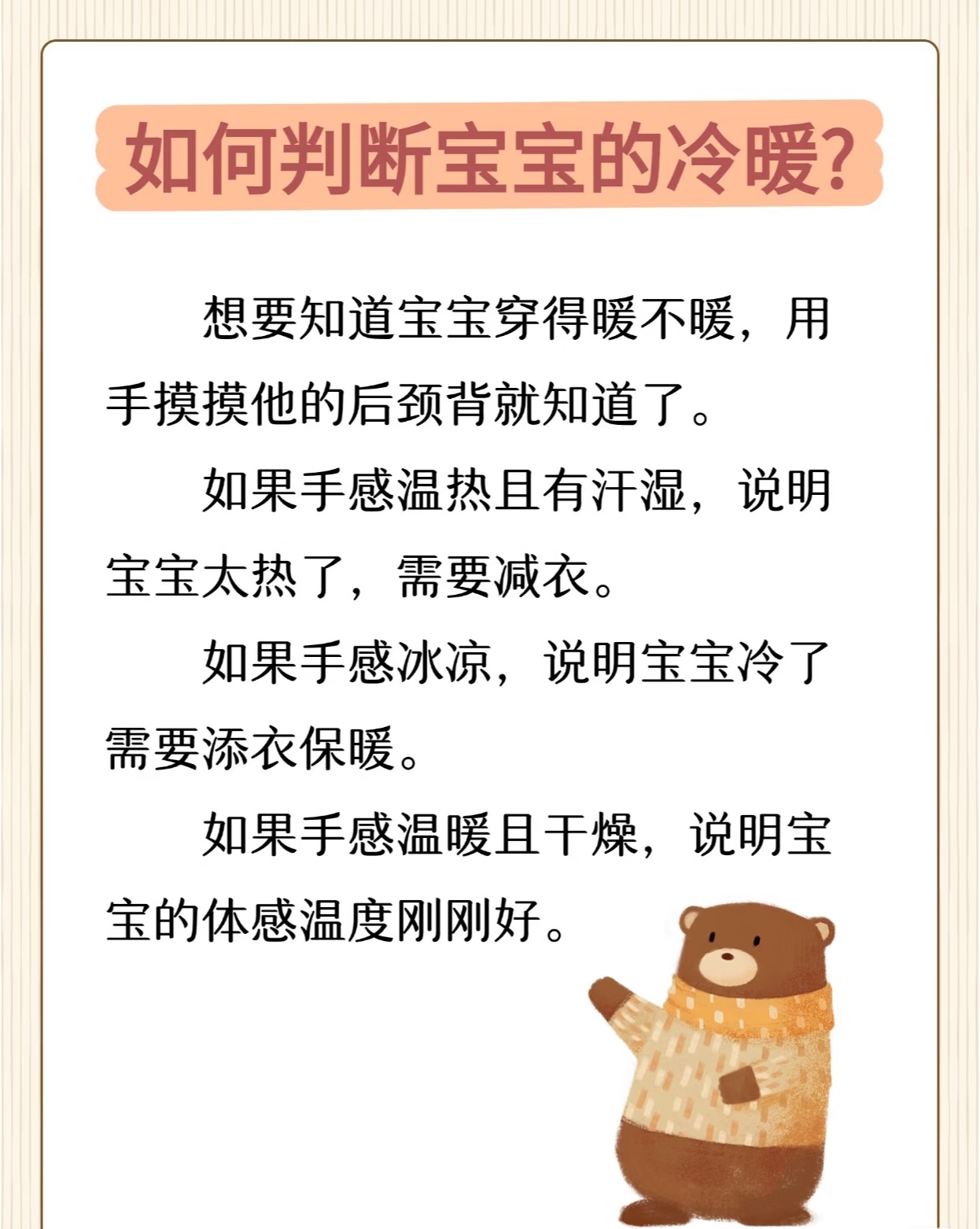 一个简单的判断方法:摸宝宝后颈。温热干燥——刚刚好;潮热有汗——穿多了;偏凉——加一件外套。手脚微微凉是正常的,不用过度紧张。