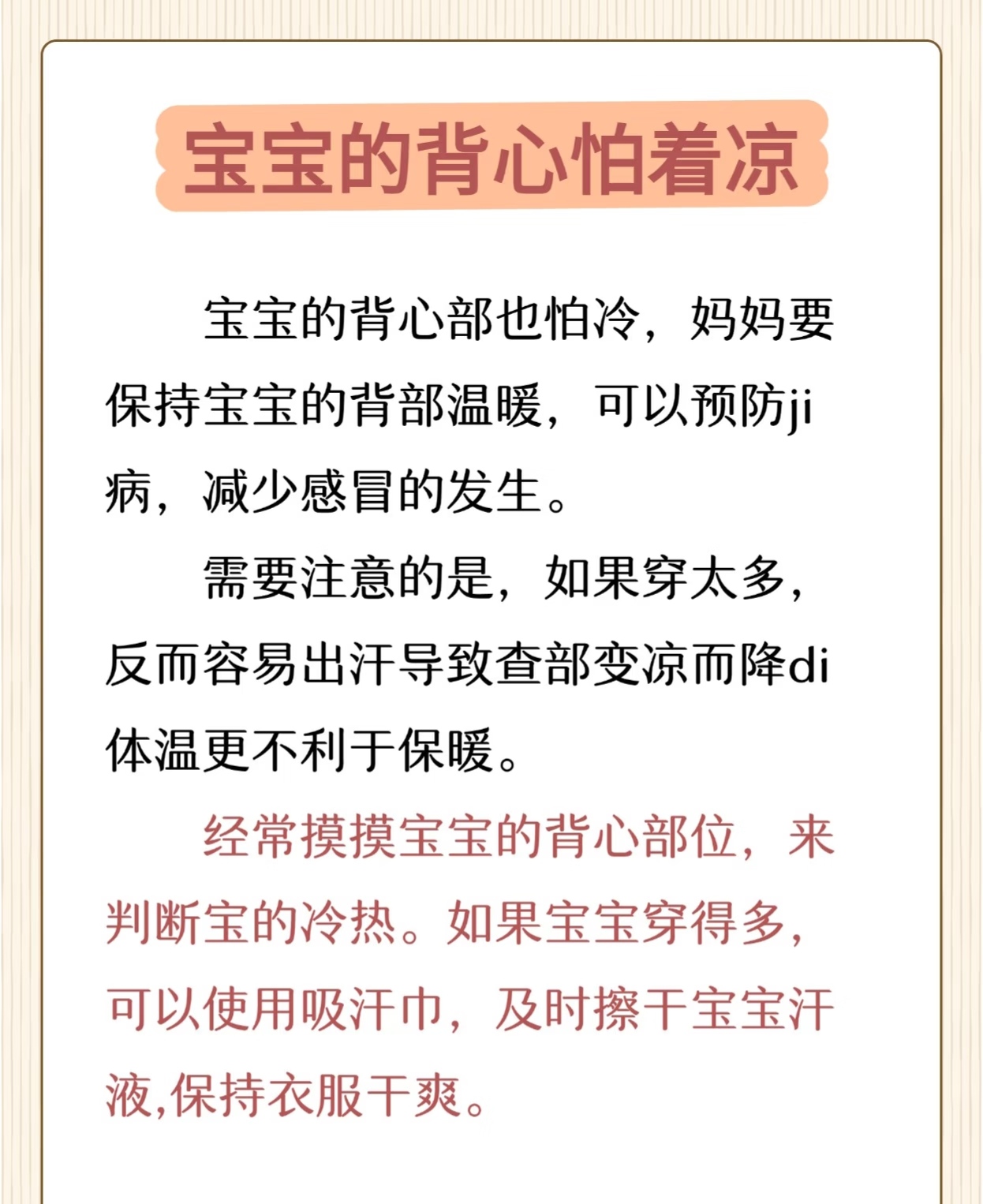 后背是判断宝宝冷热最准的地方。很多家长不知道:后背温暖干燥,说明穿得刚好;后背潮乎乎的,说明穿多了;后背凉凉的,说明该加衣服了。
