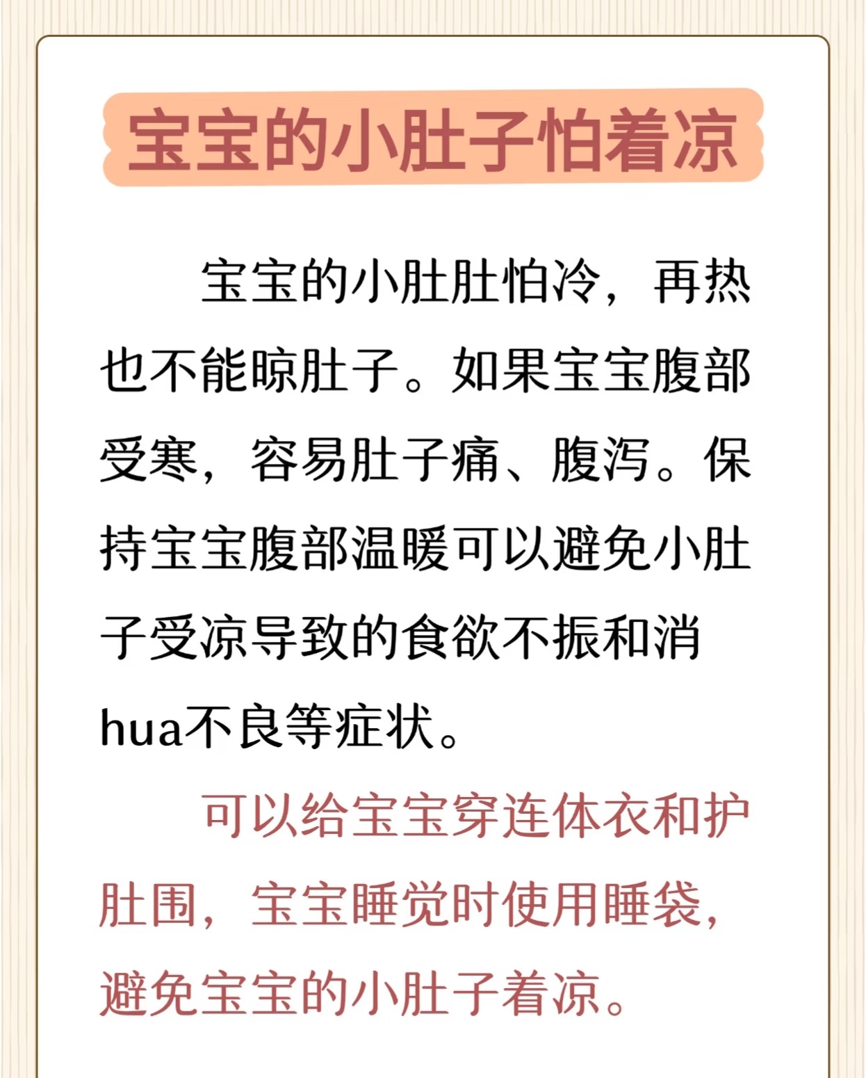 宝宝肚子一着凉,十有八九要闹肠胃问题。因为腹部脂肪薄、脏器多,受凉后肠道蠕动会紊乱,轻则胀气、哭闹,重则腹泻、消化不良。