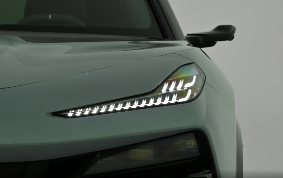 从外观设计来看,莲花ForMe与莲花ELETRE非常接近,仅仅在一些细节方面有所不同,所以接下来我们就简单欣赏一番该车的外观设计。即便屏幕前的大家不知道它的身份,但打眼一看就知道这是一辆性能车,整体外观设计风格大胆激进,加入大量空气动力学套件,提升运动气息的同时优化操控。前脸设计犀利大胆,引擎盖呈下滑态势,进一步压低车头视觉重心,如此一来便衬托出更加尖锐的鼻翼造型,配合两侧上挑的狭长日间行车灯,看起来就不好惹。