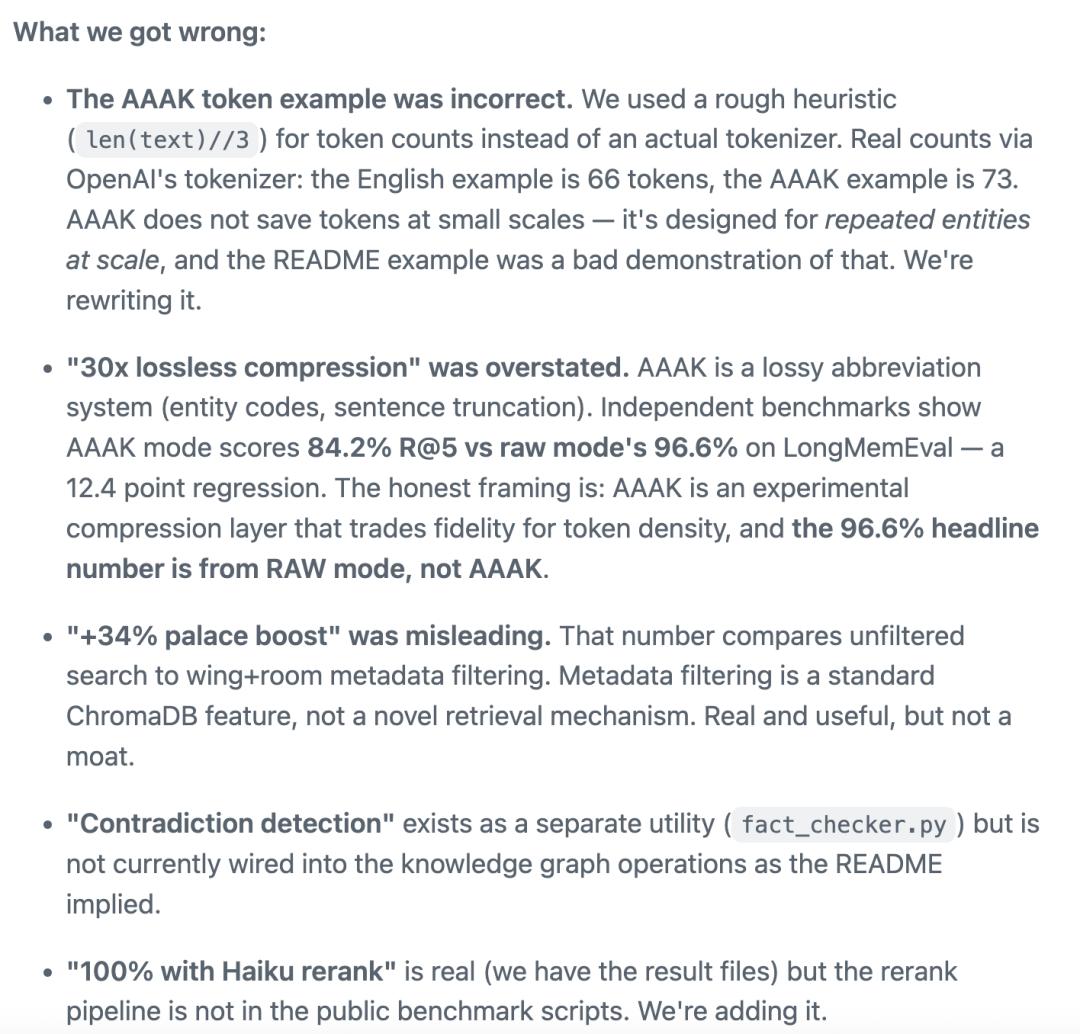 「30倍无损压缩」,承认夸大改口为「有损缩写系统」。「+34%宫殿增益」承认措辞误导,补充说明是标准元数据过滤。