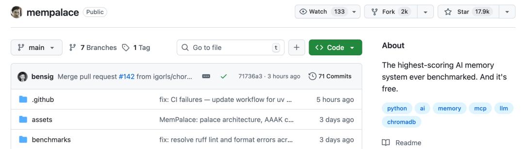 如今,在GitHub上,MemPalace已狂揽17.9k星,Fork高到2k。