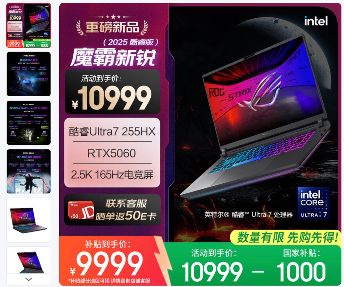 不过好消息是,面对上游成本压力,近期的政补成为消费者购机的“缓冲垫”,以往高高在上的高端游戏本,在政补加持下纷纷回到亲民价位。以ROG魔霸新锐 2025为例,这款原价10999元的高端游戏本,在享受双11活动+政补后,实际到手价9999,瞬间成为万元价位段最具竞争力的高性能游戏本,这对于近期有换本需求的用户来说,现在确实是一个值得入手的好时机。