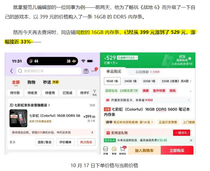 如果你还在犹豫是否该在近期换一台高性能游戏本,接下来的消息可能会让你下定决心:存储芯片价格正迎来新一轮暴涨,三星、SK海力士等大厂已确认第四季度DRAM和NAND闪存价格最高上调30%。这意味着现在不买,明年可能要多花上千元,现实就有网友反馈:自己为了畅玩《战地 6》而升级了一下自己的游戏本,以 399 元的价格购入了一条 16GB 的 DDR5 内存条,然而再去查询时,同店铺同款的 16GB 内存条,已经从 399 元涨到了 529 元,涨幅接近 33%。