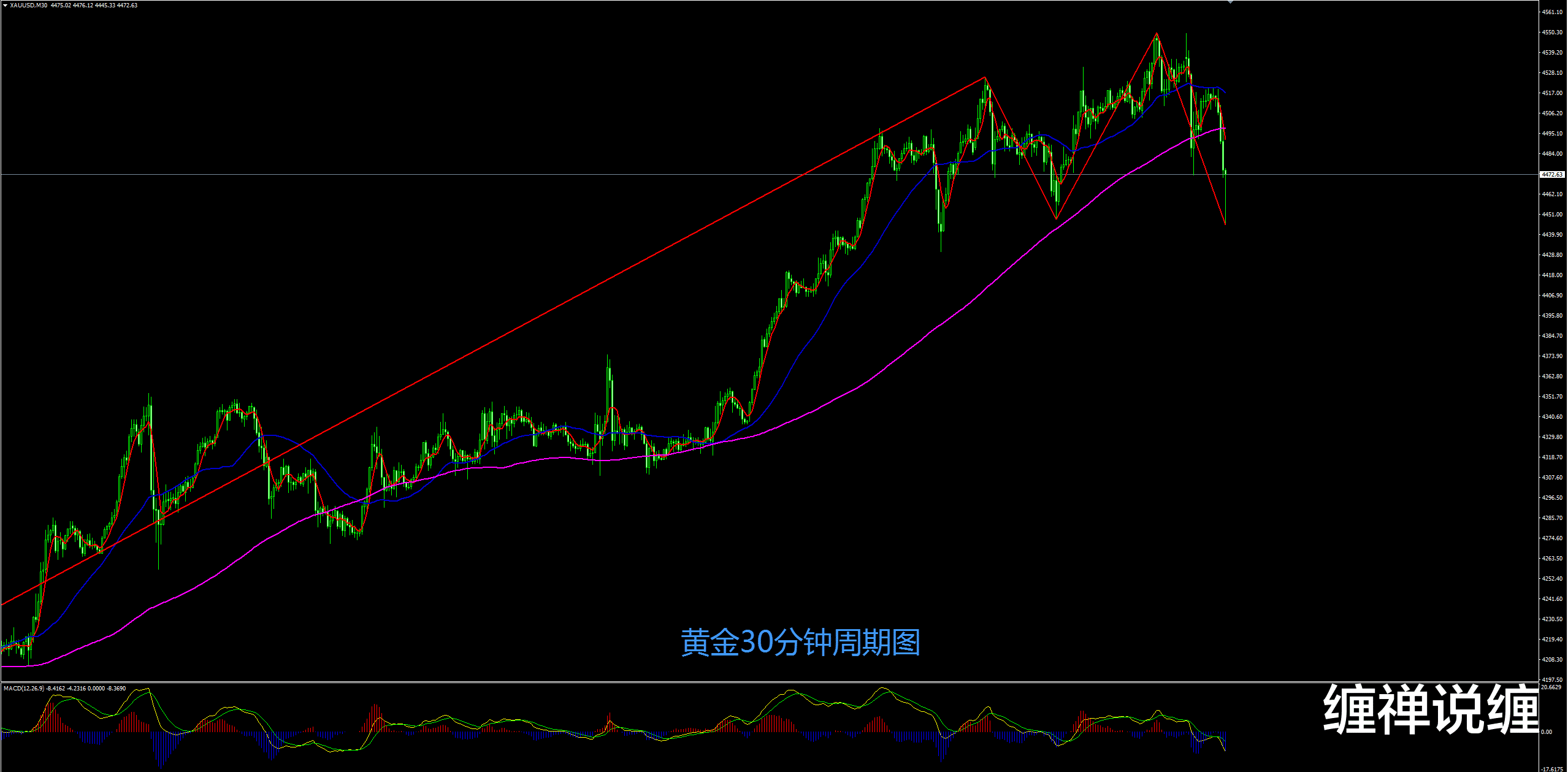 黄金30分钟短线开始转弱,黄金如果继续跌破4445,那么黄金30分钟短线可能有望延续下跌,黄金如果不破4445,那么黄金可能开始反弹,不过黄金反弹只要不能突破站稳4520,那么黄金30分钟还是有望延续下跌,黄金短线反弹还是继续空。黄金短线冲高回落转弱,短线弱势有望延续!