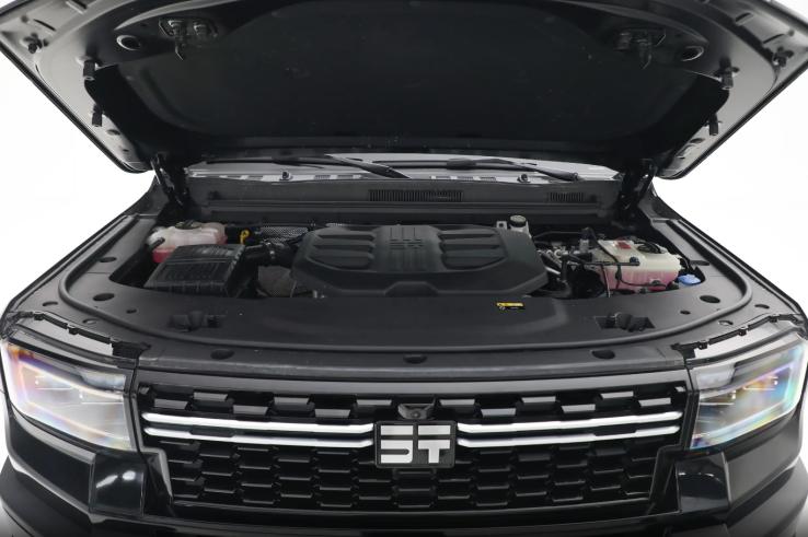 作为一款正统硬派越野车,新车采用非承载式车身设计,配备“前中后三把锁”,支持智能全地形模式和2挡低速四驱,另配备空气悬架和CDC可调阻尼减振器,提升了整车的越野通过性和行驶质感。在基础硬件参数方面,新车接近角35°,离去角28°,最小离地间隙230mm,空悬升到最高,最大离地间隙320mm,空悬涉水条件下,整车涉水深度最高可达970mm,理论上面对绝大多数行车场景都能保障通过性。