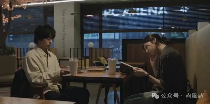 继漫画房咖啡灯光由暗到明的一个过渡之后,第二次面对面对话的咖啡厅干脆换到了明亮、色彩鲜明的地方。从暗黄到明黄色的空间、从只有两人的半包围空间到多人的开放空间,两人的对话氛围更轻松明快,话题也更丰富(更奇奇怪怪~)