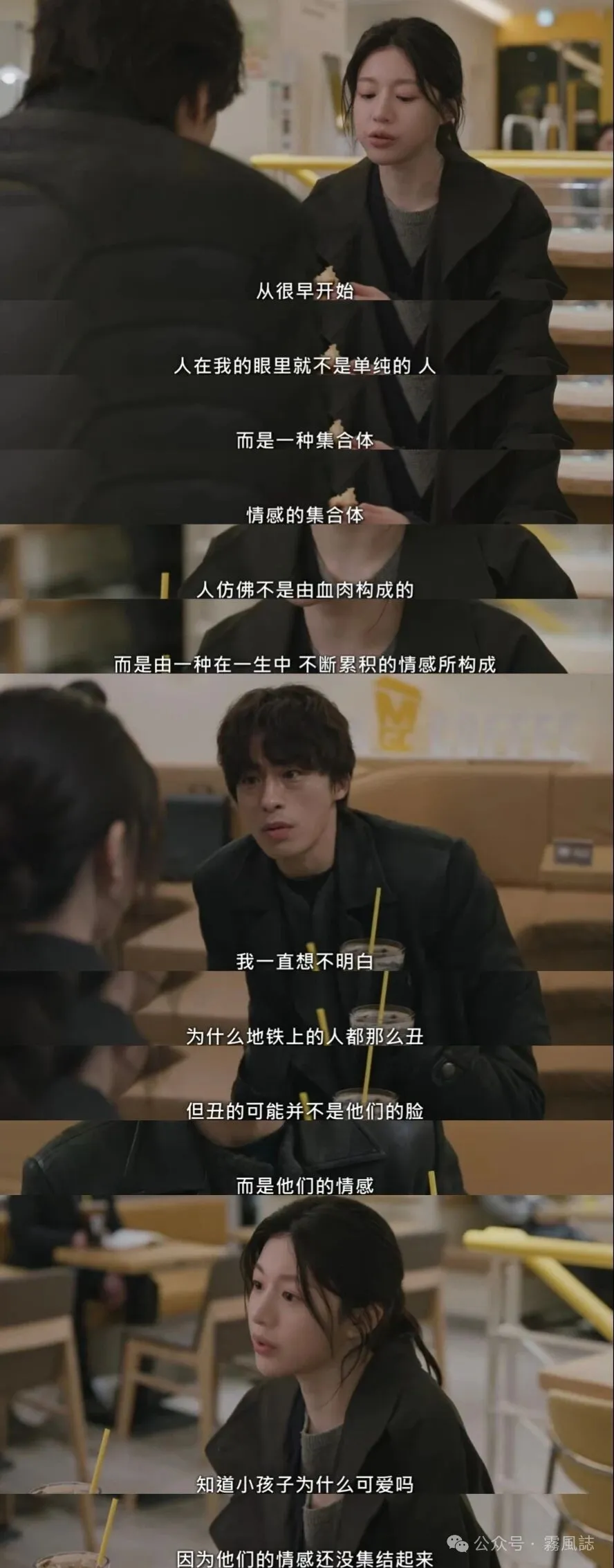 东满在恩雅面前温柔、乖顺、且通过她发现自己有人性的一面;同理,朴景世在东满身上投射自己的恐惧与不安,于是东满也在景世面前喋喋不休、互相攻击。