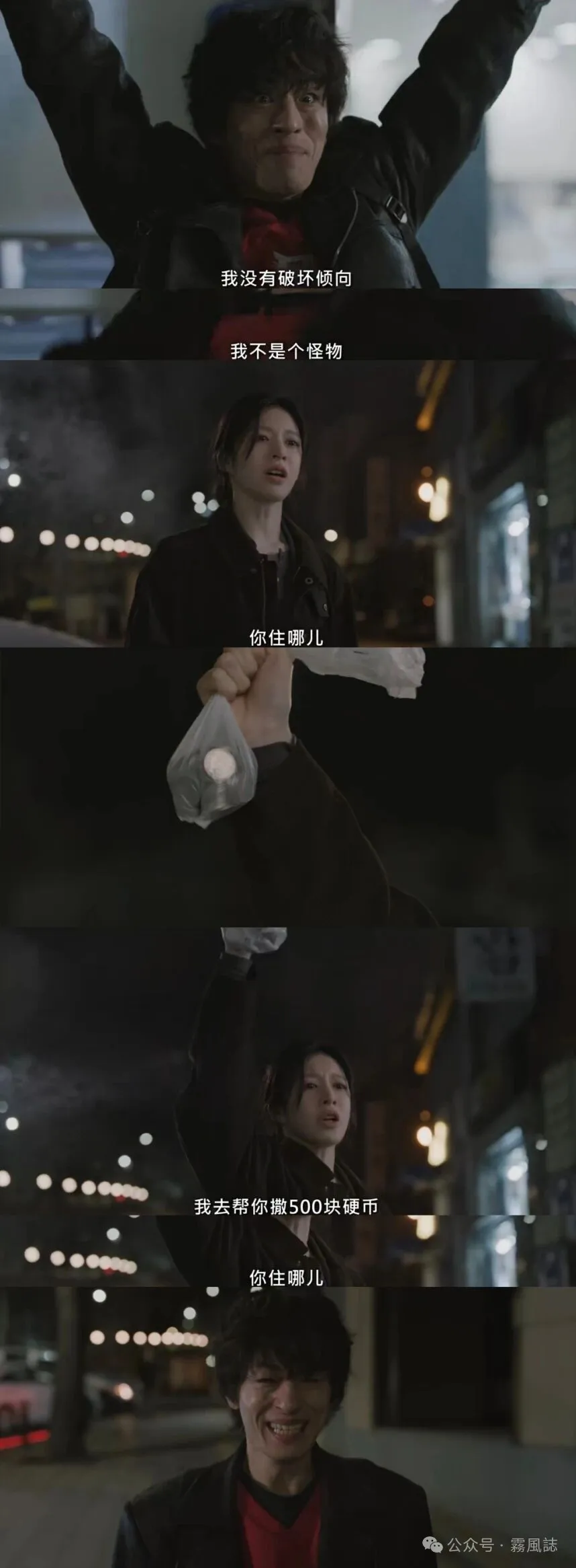 到这里还比较好理解,接下来恩雅的举动更抽象,她掏出一袋子500元硬币,要帮他撒钱······在这个情境下真的好突兀、好奇怪,好喜欢!这里callback了前面东满说心情低落时、捡到500块硬币是个小小的胜利、可以改善心情。