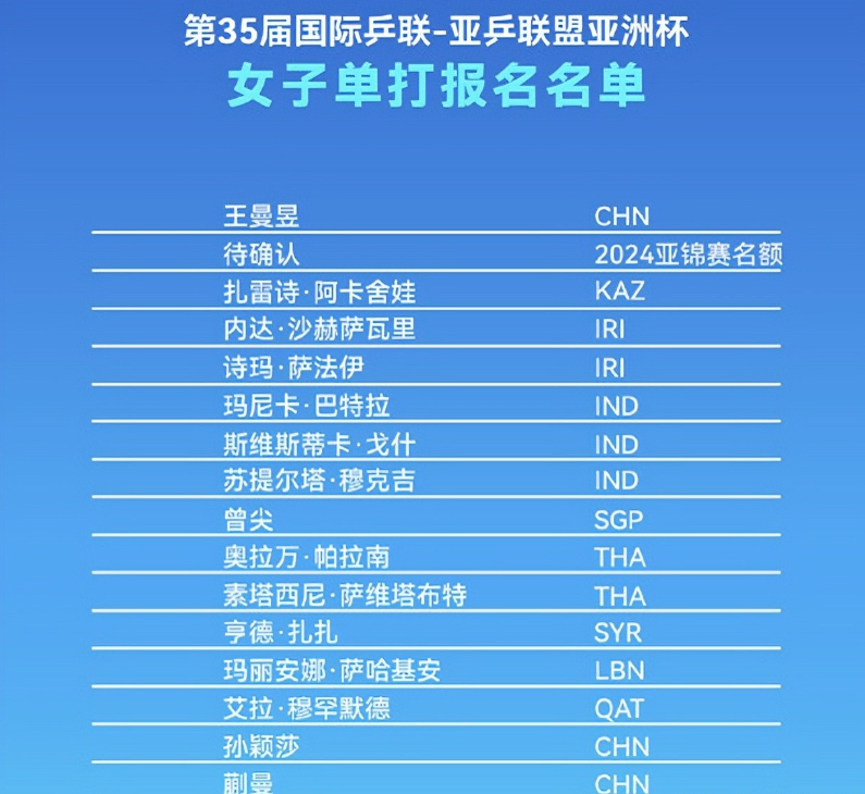 倒计时一个月的2026年亚洲杯即将拉开战幕,亚乒联于今日凌晨正式公布了男女单打共32人的参赛大名单。国乒阵容中,卫冕冠军王楚钦、王曼昱悉数在列,备受球迷牵挂的孙颖莎也确认出战,这一消息让即将于2月4日在海口开赛的赛事热度提前攀升。