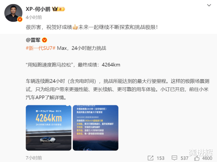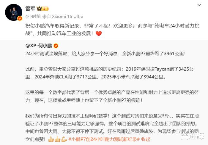 这标志着,全新小鹏P7 24小时耐力测试总里程超过小米YU7,后者跑了3944公里。对此,雷军转发何小鹏微博,并写道,“祝贺小鹏汽车取得新纪录,非常了不起!欢迎更多厂商参与‘纯电车24小时耐力挑战’,共同推动汽车工业的发展!”而何小鹏附和道,“欢迎更多友商参与。”