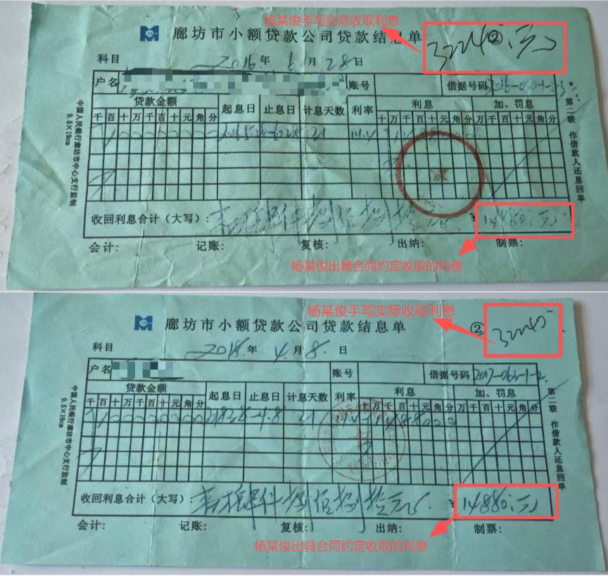 “合同上写的利息,和借款人实际支付的利息,根本不是一回事。”一位借款人坦言。实际操作中,贷款方要求借款人支付的利息远高于合同约定,而超额部分多被要求以现金方式支付,从而避免留下银行流水痕迹。“作为‘合规’的证明,同安公司会向借款人出具《贷款结息单》,但结息单上显示的是合同约定的较低利息数额。不过经办人杨某俊有时也会‘疏忽’,在单据的右上角用笔注明借款人实际支付的高额利息数字。”借款人赵新田说。