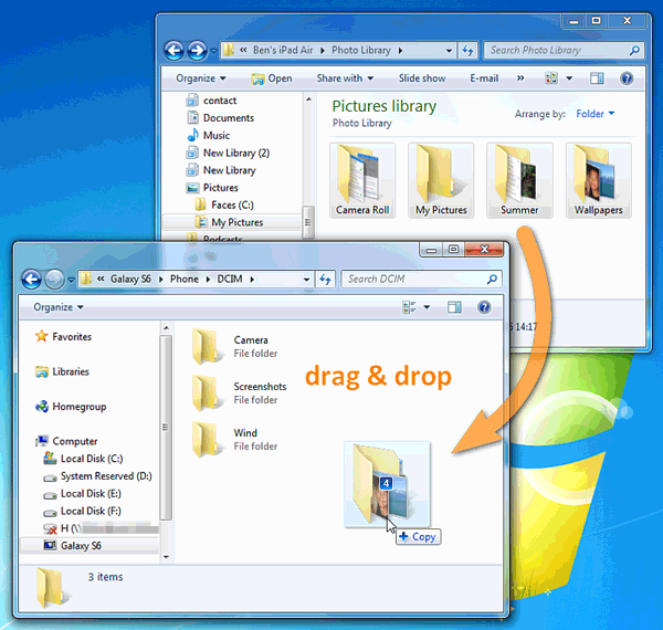 步骤 3:确保Android照片文件夹和电脑照片文件夹并排显示。开始将照片从电脑照片文件夹拖到Android照片文件夹。就这么简单。使用这种方法,您可以轻松地将电脑上的照片传输到手机。