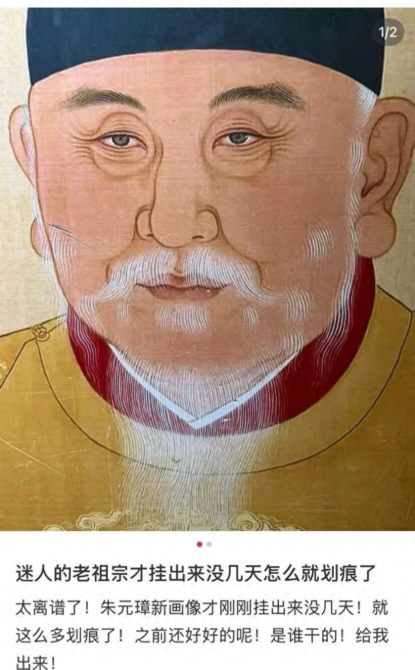 前不久,新版历史教材更换朱元璋画像的话题引发热议,原因是伴随几代人成长的“鞋拔子脸”形象已被五官匀称、面容庄重的正像取代。近日,有网友称南京明孝陵朱元璋画像被划伤,被划伤的正是网友口中的“帅版”画像。