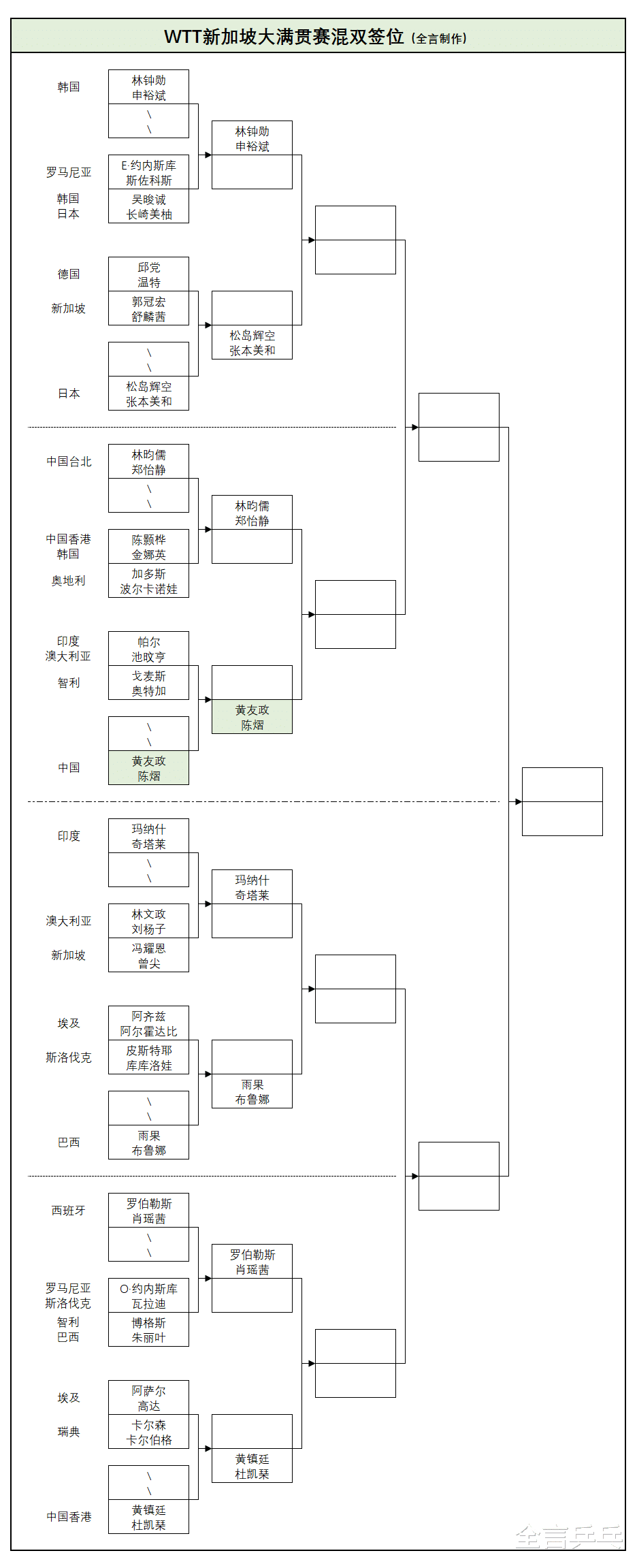 2026年2月20日晚,乒乓球WTT新加坡大满贯赛混双抽签结果出炉,国乒唯一报名的黄友政/陈熠在所有组合中仅排名第7位,而且两人都不是队内的主力运动员,虽然也拿过国际比赛冠军,但与2000积分级别的大满贯赛相距甚远,这次能走多远难以预料,想登顶困难重重!详细签表请看下文。