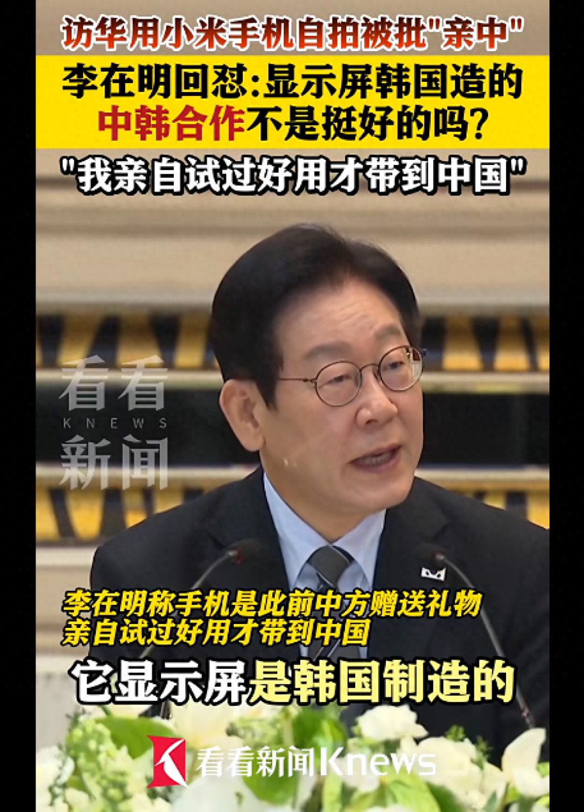 1月4日至7日, 韩国总统李在明访问中国。因使 用小米手机自拍被韩国人批“亲中”, 近日,李在明笑着回怼 : “ 小米手机显示屏是韩国造的, 中韩合作不好吗?这款手机的显示屏是韩国造的,是中韩两国合作的产品。”