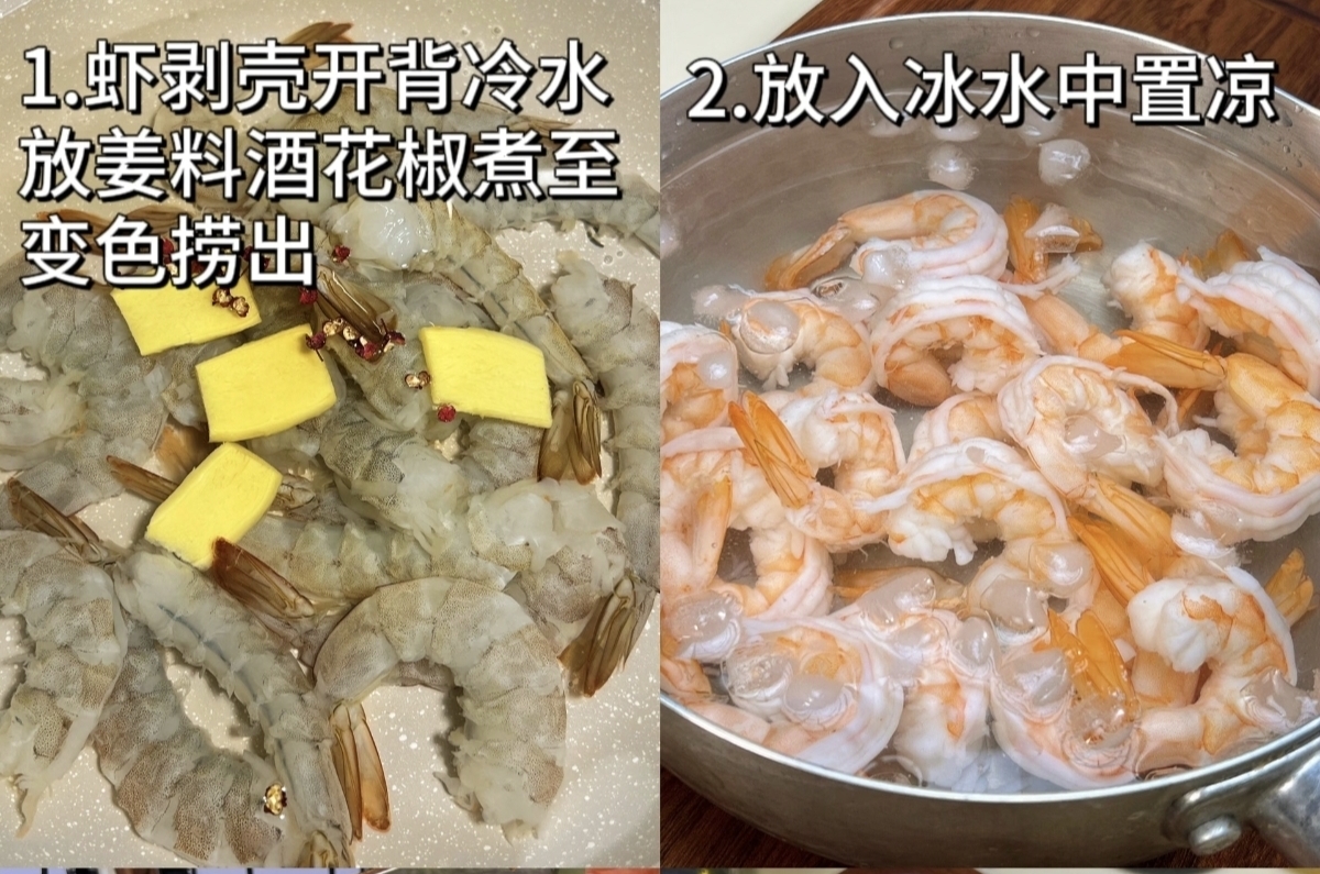 处理大虾是保证口感的关键。将大虾去壳、开背,仔细挑出虾线,这样既能让虾肉更易入味,也能保证口感干净。锅中加入冷水,放入处理好的虾,同时丢入几片姜、几粒花椒和少许料酒,开大火煮至虾身完全变红、肉质紧实,就可以立刻捞出。想要虾肉达到Q弹的巅峰状态,秘诀在于“过冰水”:准备一碗装满冰块的凉水,将刚出锅的热虾迅速投入其中,利用热胀冷缩让肉质瞬间收紧,这样处理后的虾,咬下去每一口都脆嫩弹牙,口感绝佳。