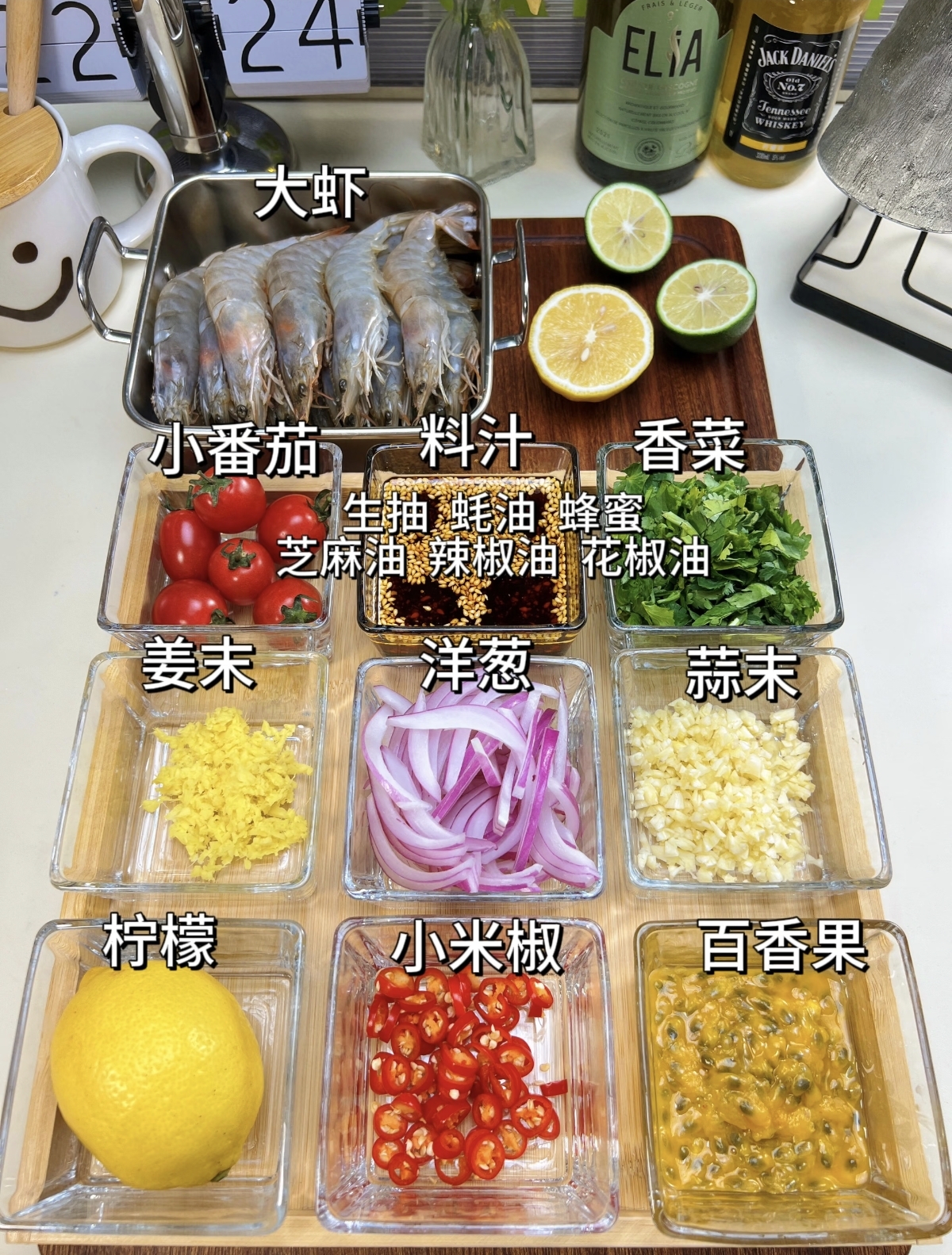 制作这道美味,首先要准备好所有食材。主角自然是新鲜的大虾,约250克便足够一家人享用,也可以直接选用处理好的虾仁,更加省时。柠檬是这道菜的灵魂,需要准备两个,一个切片装饰,一个挤汁提味。再配上一个酸甜的百香果,能让风味更有层次。辅料方面,半个洋葱切丝,小番茄对半切开,一把香菜切段,再准备好姜末、蒜末和切碎的小米椒,这些辛香的配料会让整道菜的香气瞬间立体起来。最后,也是最关键的一步,是调制那碗“灵魂料汁”:在碗中倒入40克生抽、7克蚝油、10克芝麻油、10克辣椒油、6克藤椒油,再加入1.5克蜂蜜调和味道,搅拌均匀后,这碗复合风味的料汁就准备好了,它将是整道菜风味的核心。
