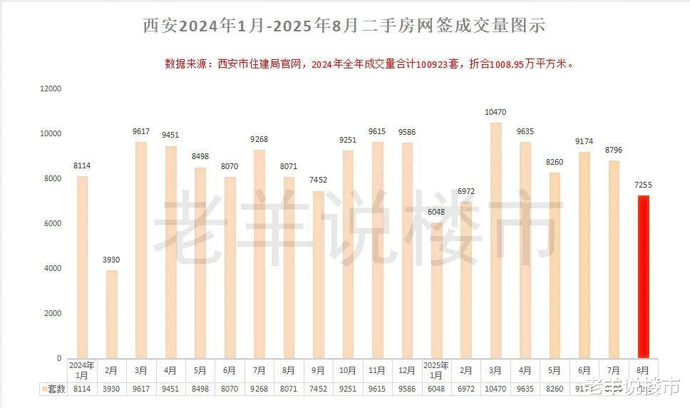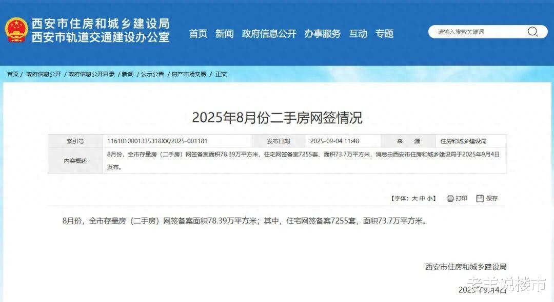 2025年9月4日,西安8月份二手房网签数据发布,全月住宅网签量7255套,折合面积73.7万平方米,环比下滑16.9%,同比下滑8.5%。