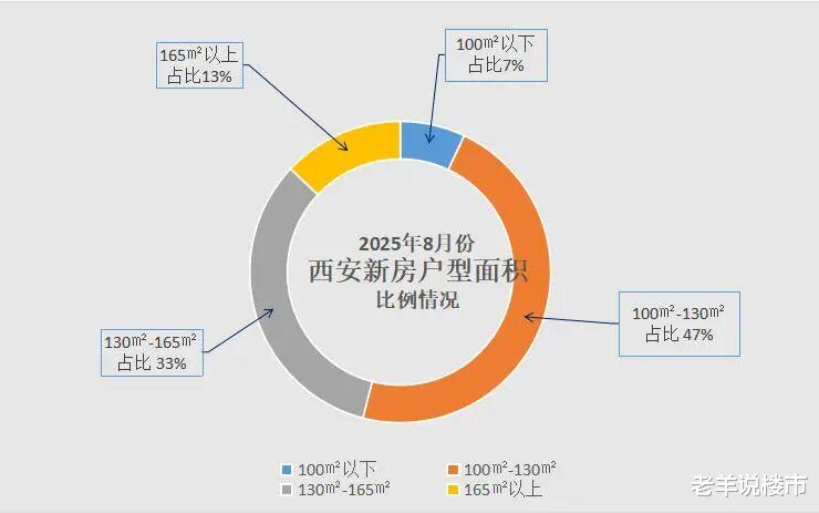 8月份西安共有24个楼盘加推,总计4165套新房取证,其中户型100㎡以内占比7%,100-130㎡占比约47%,130-165㎡占比约33%,165㎡以上约占比13%,偏刚需、刚改供应的加大,也给了这个群体更大的选择空间。