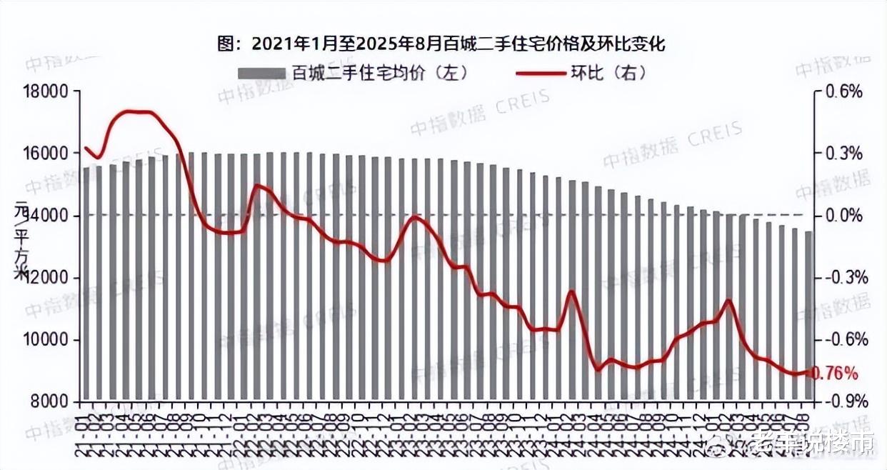 在8月份二手房跌势持续,根据9月2日中指研究院发布数据,8月份100个城市二手住宅平均价格为每平方米13481元,环比下跌0.76%,跌幅较上月收窄0.01个百分点,同比下跌7.34%。