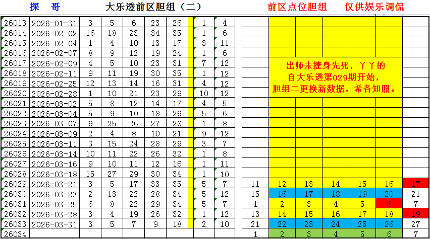 自大乐透第029期开始, 胆组一、胆组二更换新数据,希各知照。
